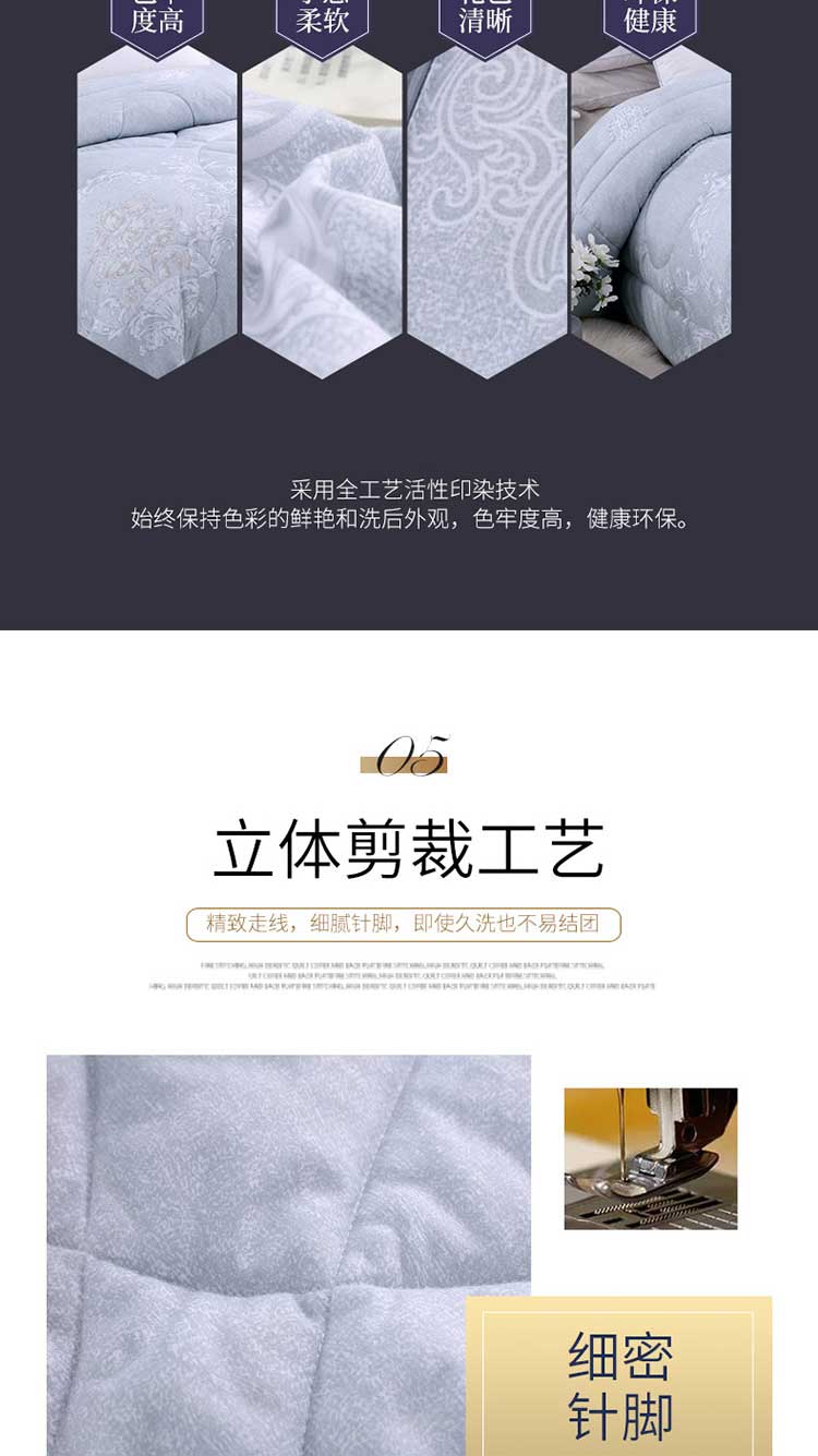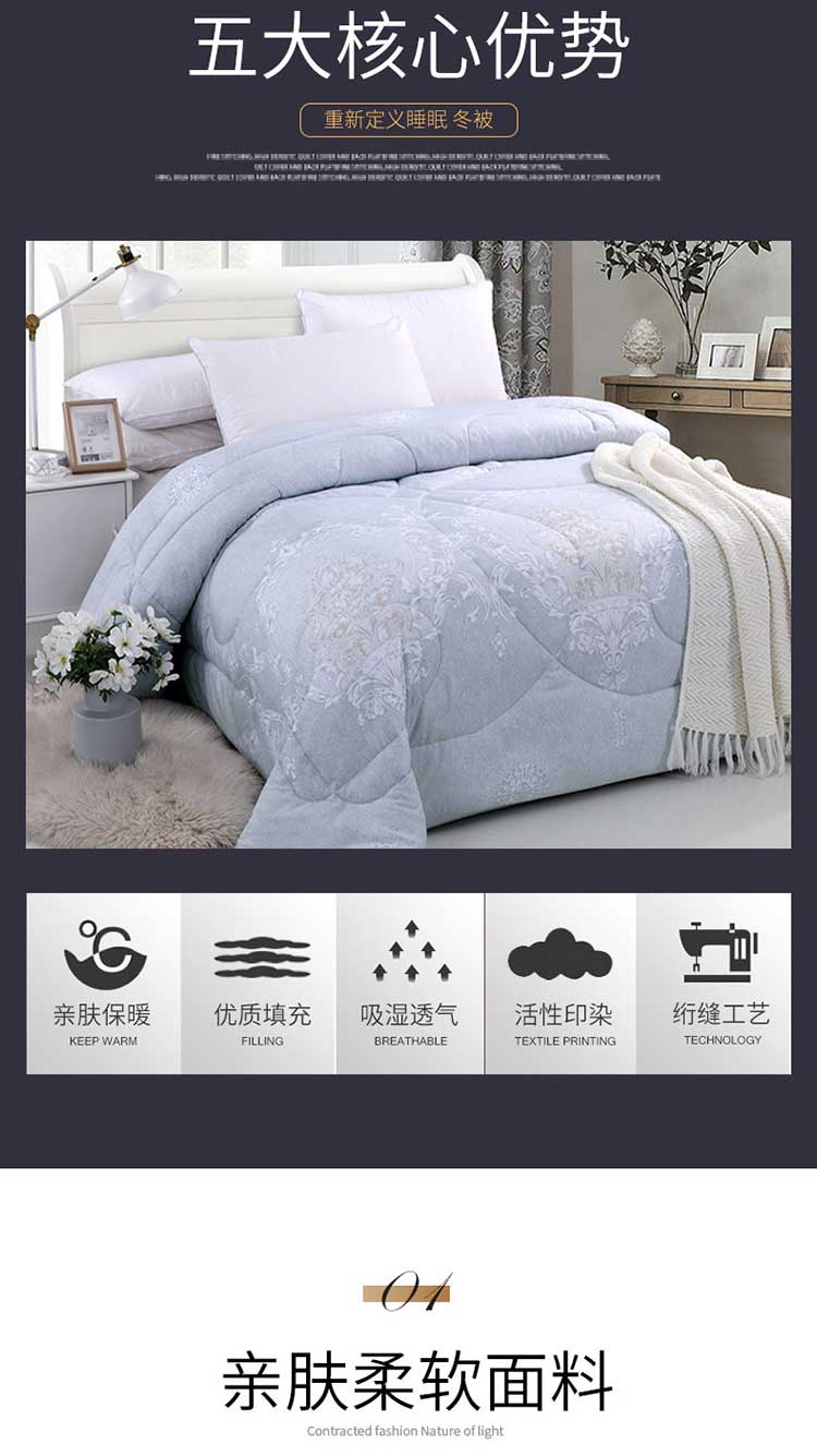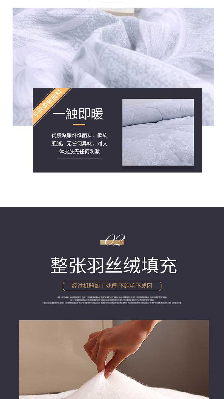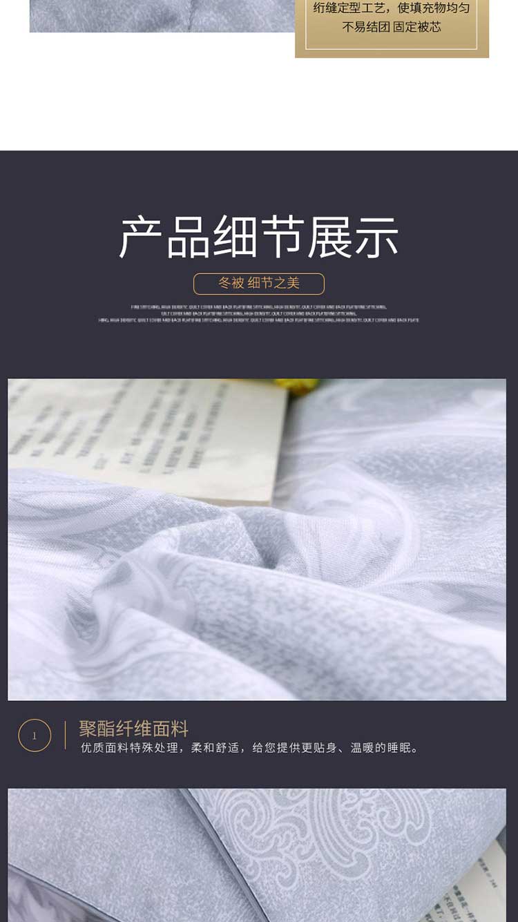 产品规格: 200*230cm 面料成分: 面料 聚酯纤维 填充充分:聚酯纤维100%,填充克重1500g 工 艺: 活性印染 包装尺寸: 55*45*28cm 毛重净重: 3.85kg/2.85kg ◆高克重面料内充3斤整张羽丝棉,被子更加平整蓬松; ◆ 细腻亲肤吸湿透气,保暖性好牢牢锁住温度; ◆ 精细做工,严格把握品质; ◆ 贝壳式包边方法,内部牵线固定,不易松动成团; ◆ 活性印染工艺, 色牢度高, 不易缩水。