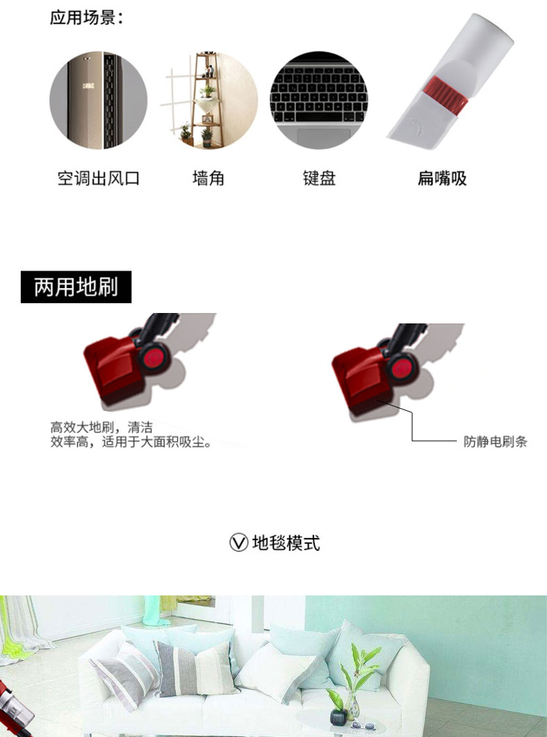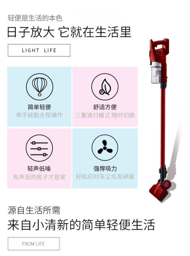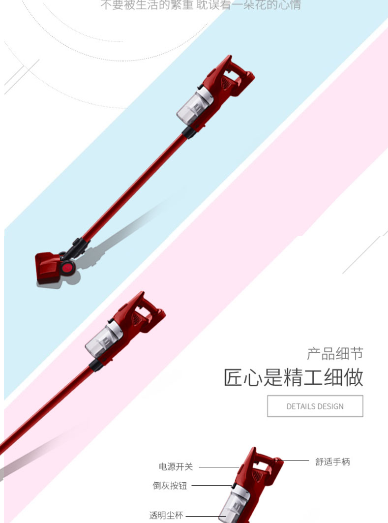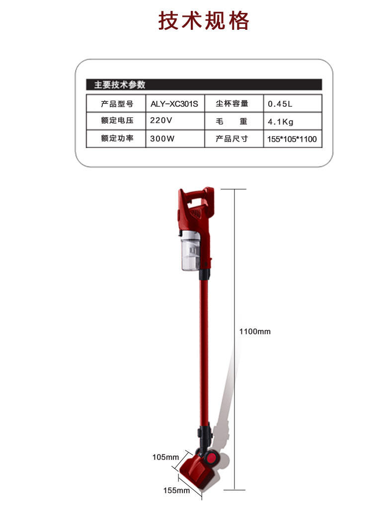 额定功率:300w 额定电压:220V~ 容 量:0.45L 产品尺寸:155*105*1100mm 彩盒尺寸:680*230*165mm 毛 重:4.1kg 装箱规格:6台/箱 1. 有线设计,乐享除尘 2. 手持操作、轻松便捷 3. 旋风集尘系统、尘土高效分离 4. 电动地刷、深度清洁 5. 多功能附件、全方位清洁