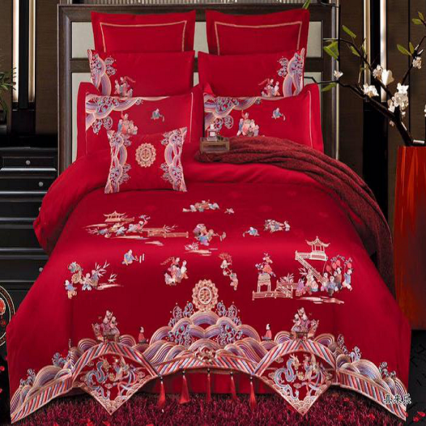 甄选高支高密贡缎提花面料,活性印染工艺,色牢度高,久洗如新。面料手感柔软细腻,睡眠亲肤舒适,被罩精致刺绣花型渲染喜庆高雅气氛,床单圆摆设计,简约大气,寓意圆满,枕套浪漫喜庆的宽边设计,提升层次感。真丝般的靓丽、珍贵高雅的刺绣,挺阔大方,衬显祥瑞美好,吉祥如意!
