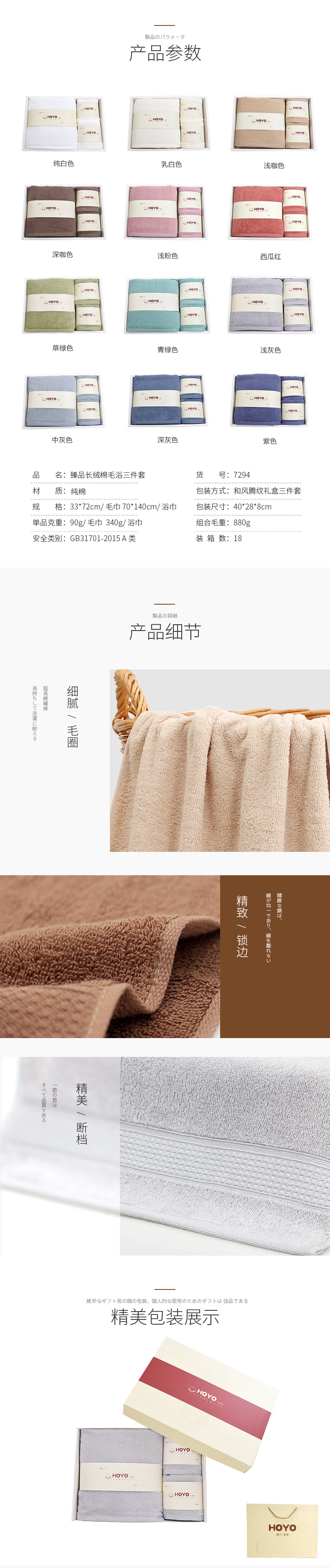 品名:7294-臻品长绒棉毛浴三件套 包装形式:和风腾纹礼盒毛巾*2+浴巾*1 规 格:33*72cm、70*140cm 单品克重:90g、340g 颜 色:3501纯白色、3502乳白色、3503浅咖色、3504深咖色、 3505浅灰色、3506中灰色、3507深灰色、3508紫 色、 3509西瓜红、3510草绿色、3511浅粉色、3512青绿色 包装尺寸:39*27*6cm 装 箱 数 :18PCS 组合毛重:1100g
