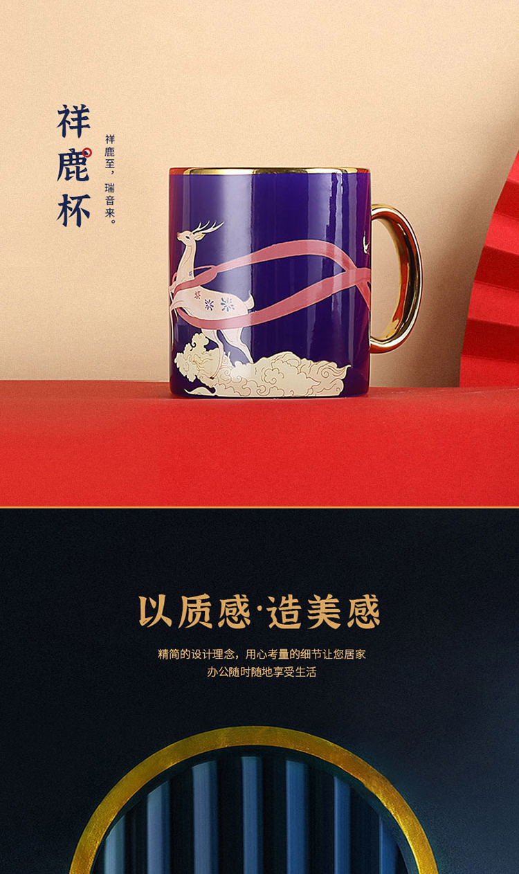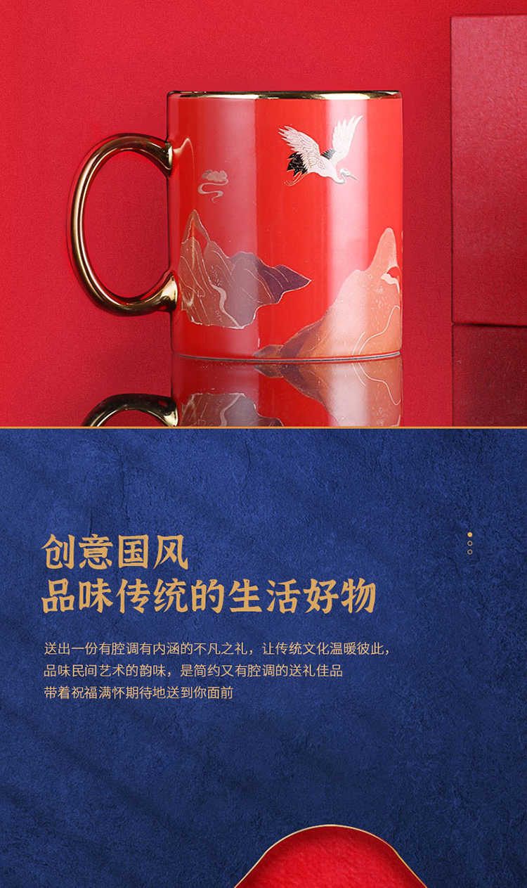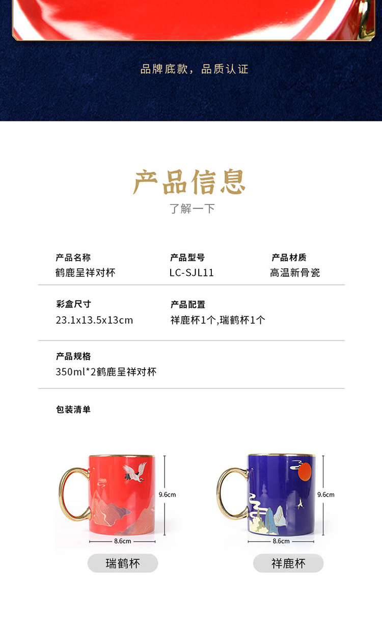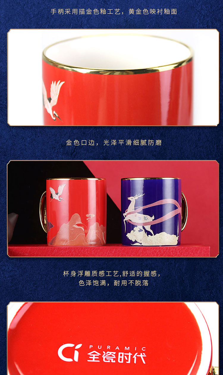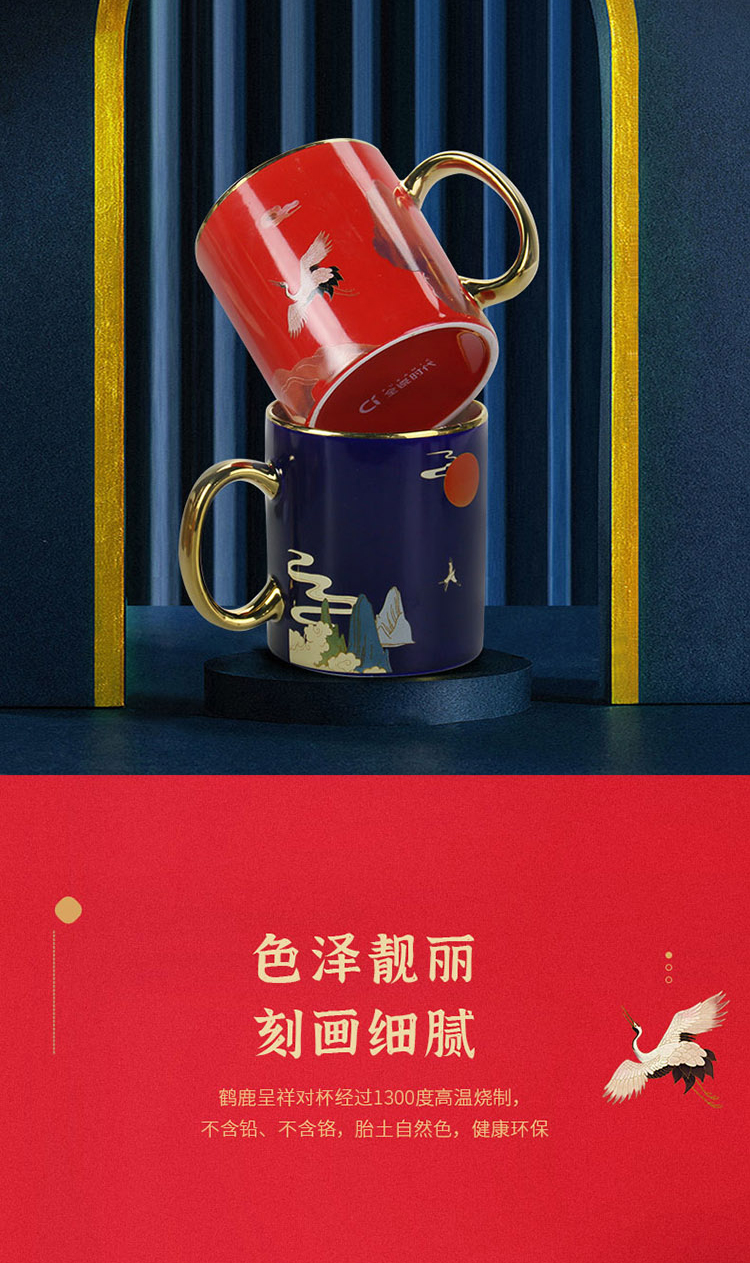 鹤鹿呈祥、延年益寿、永葆青春,向往美好的未来。 鹤鹿呈祥对杯经过1300度高温烧制,不含铅、不含铬,胎 土自然色,健康环保。 优质高岭土,光泽平滑细腻防磨。 永恒蓝加上大气中国红,经过高温釉烤花工艺,色泽靓丽饱满,防磨刮,易清易洁。 双描金色釉工艺,金色手柄、金色口边,时尚高端有档次。
