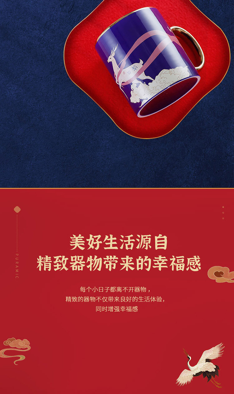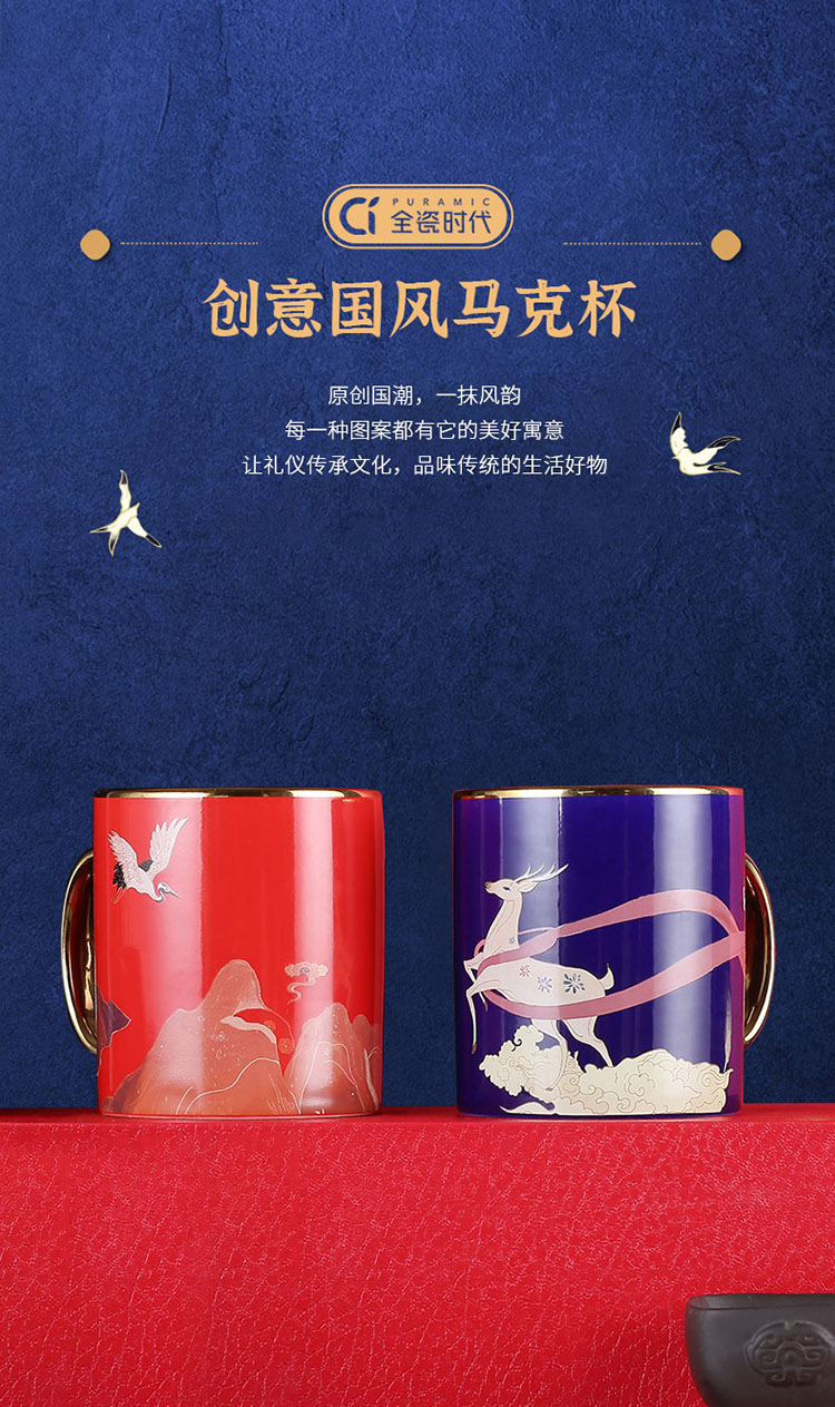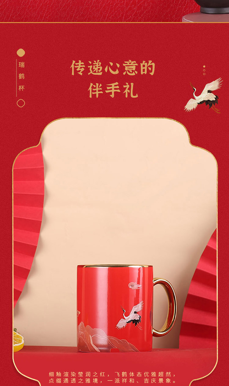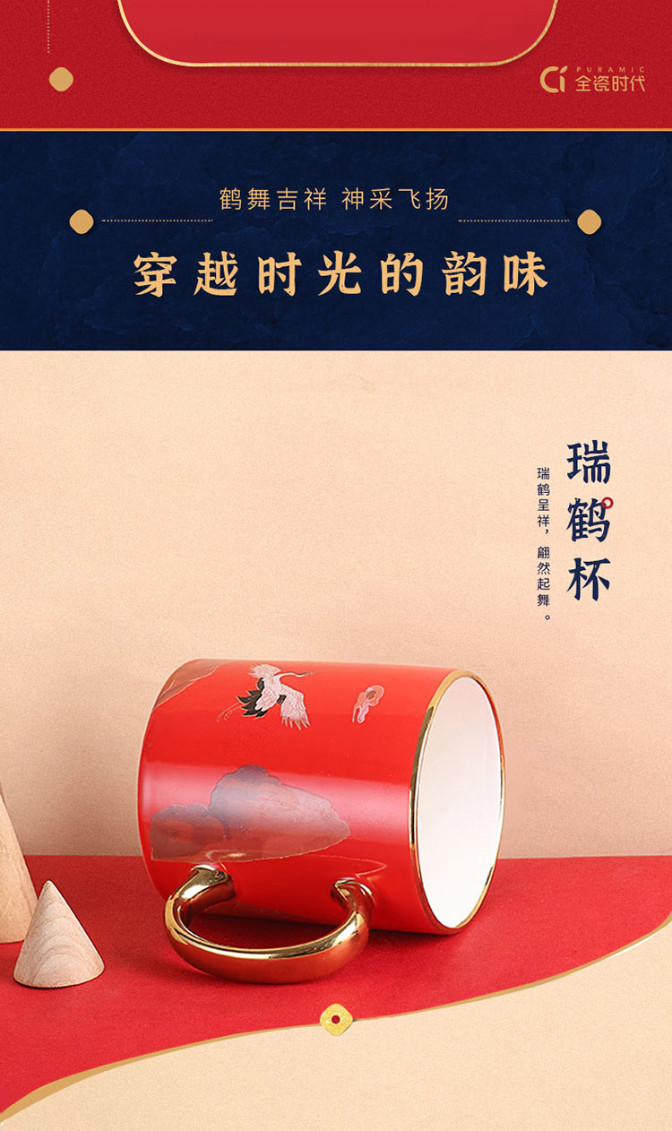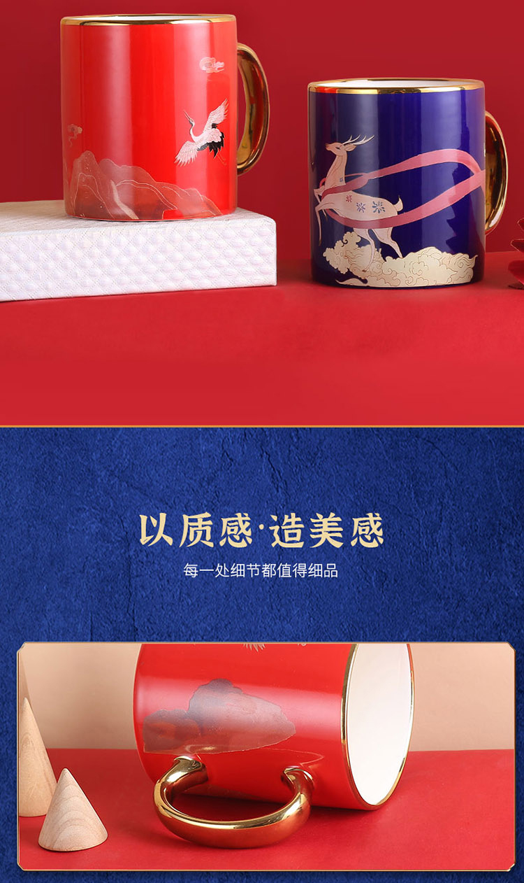 鹤鹿呈祥、延年益寿、永葆青春,向往美好的未来。 鹤鹿呈祥对杯经过1300度高温烧制,不含铅、不含铬,胎 土自然色,健康环保。 优质高岭土,光泽平滑细腻防磨。 永恒蓝加上大气中国红,经过高温釉烤花工艺,色泽靓丽饱满,防磨刮,易清易洁。 双描金色釉工艺,金色手柄、金色口边,时尚高端有档次。