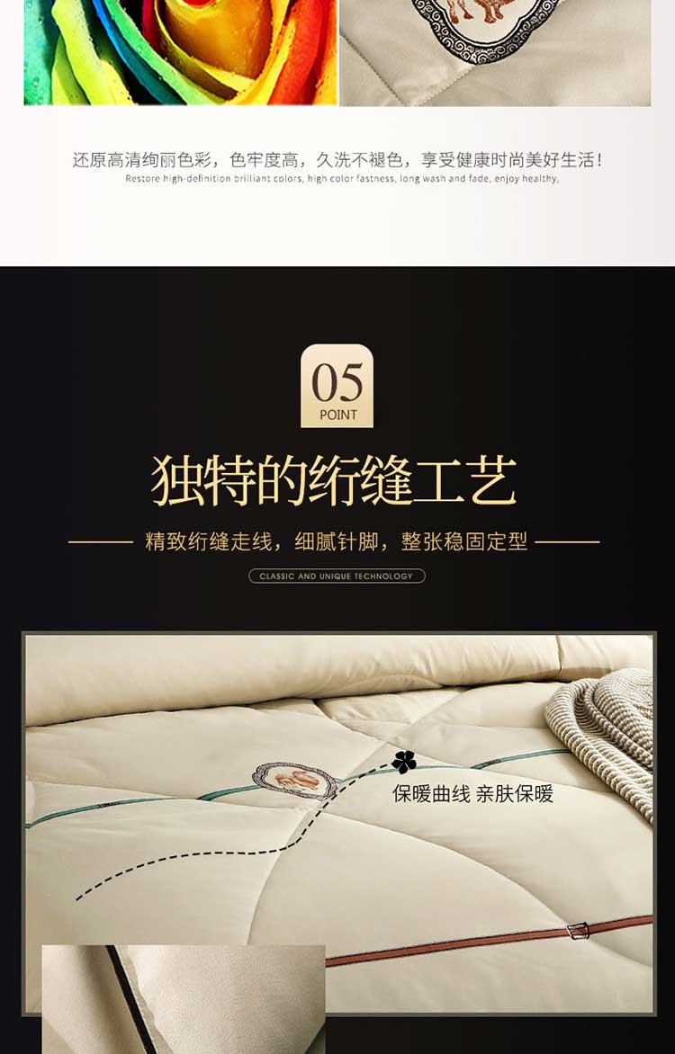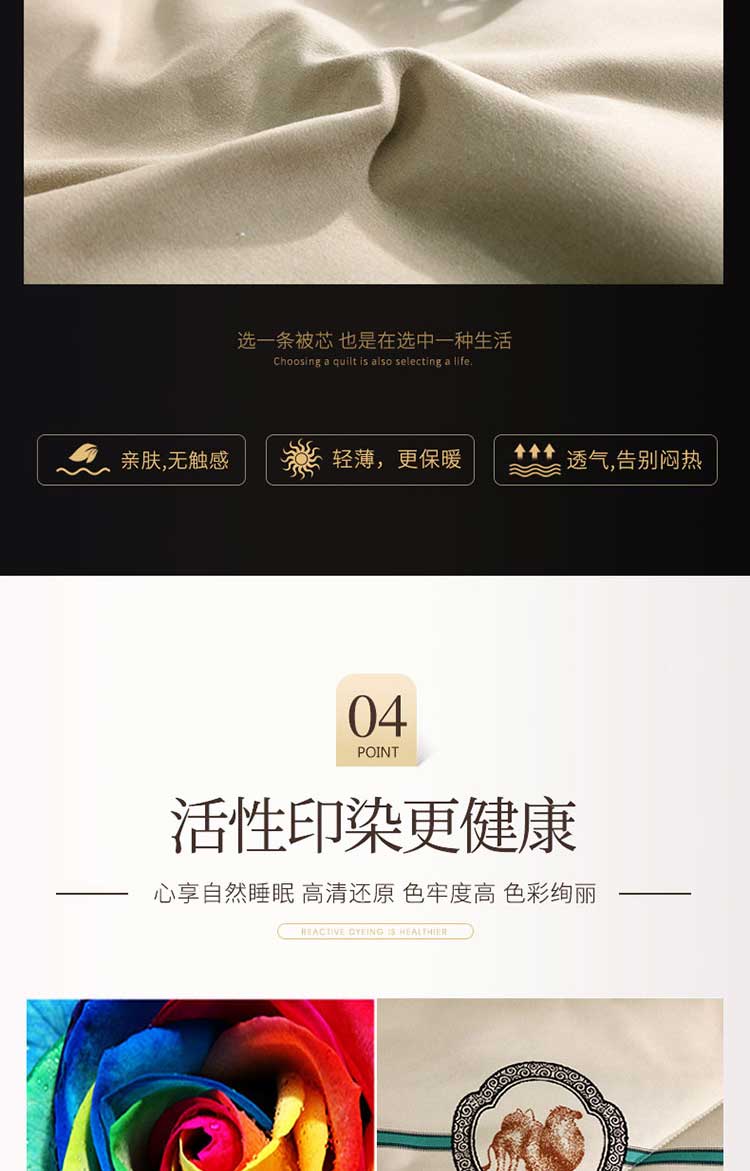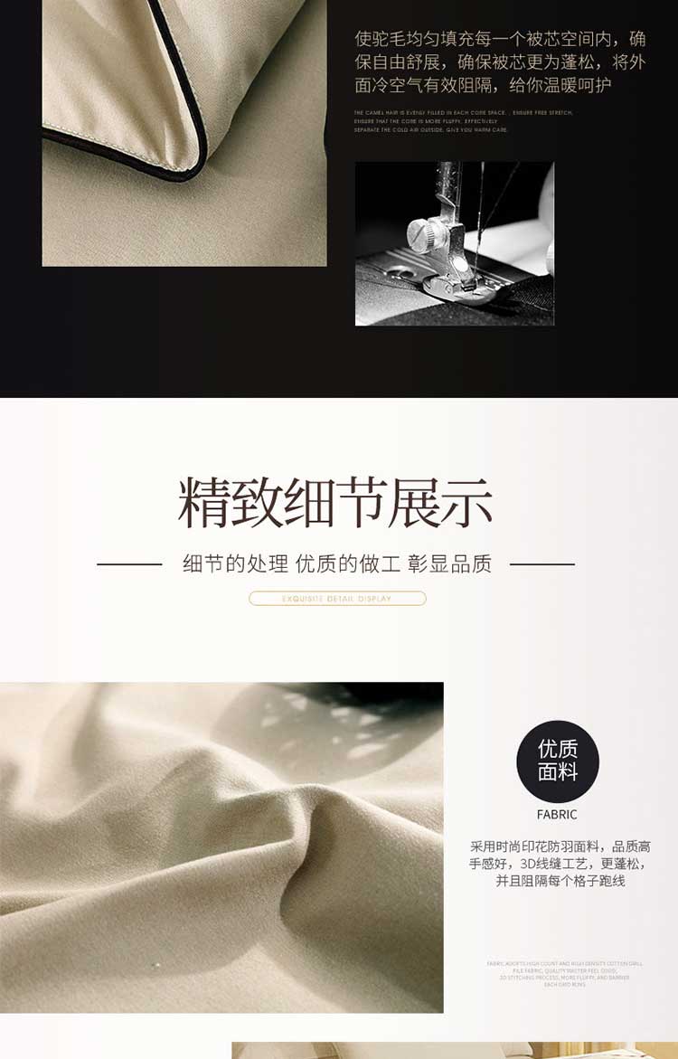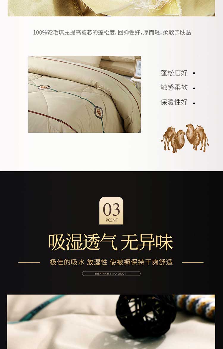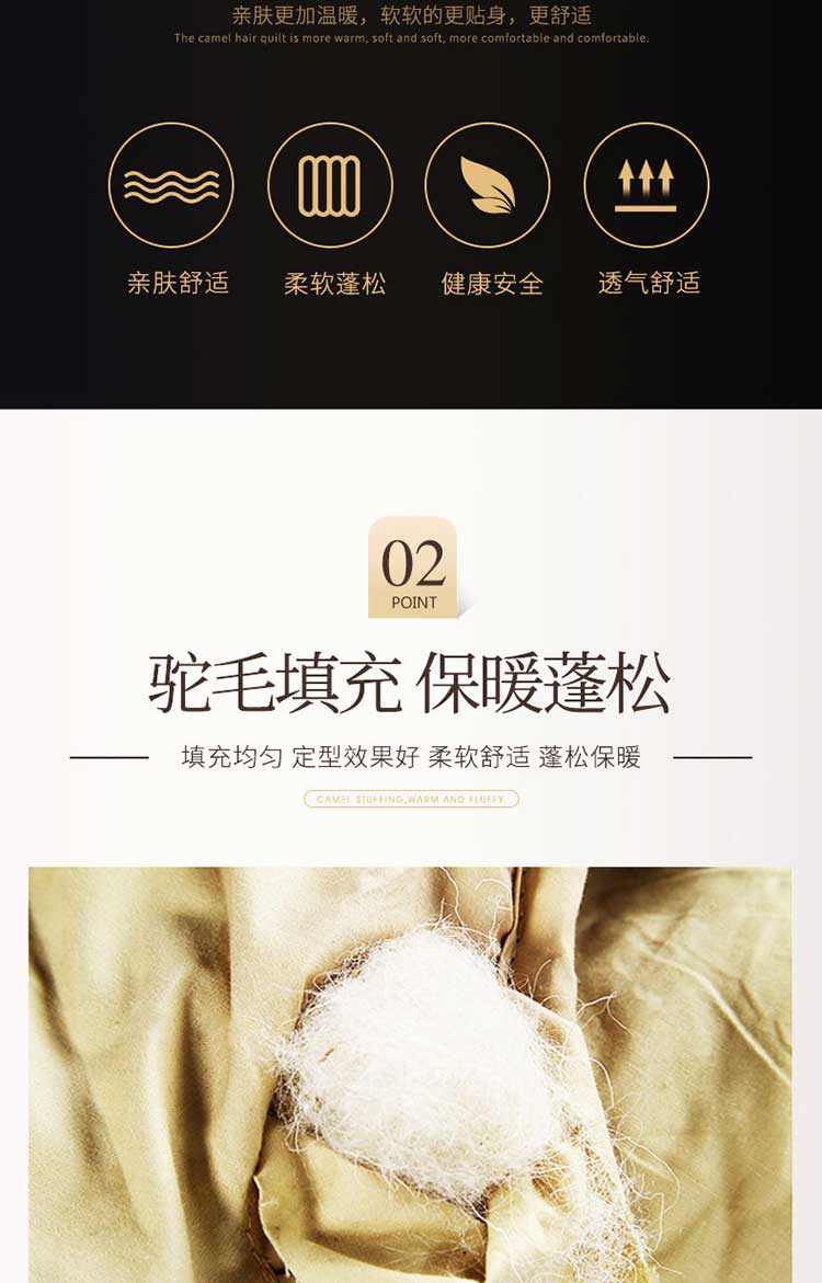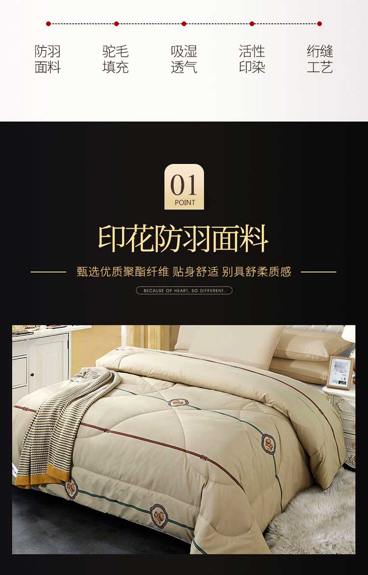 产品规格: 200*230cm 面料成分: 面料 聚酯纤维 填充充分: 驼毛100%,填充克重2000g 工 艺: 活性印染 包装尺寸: 55*45*28cm 毛重净重: 4.35kg/3.35kg ◆ 360°热循环,厚实保暖抵御寒流瞬间锁住热量; ◆ 舒适蓬松,长期使用也不会相互缠结; ◆ 晾晒无异味感,安全环保使用更放心; ◆ 健康保暖有贴身,零负担无压力。增加防衬内里,无 异味,不跑毛,使用更放心。