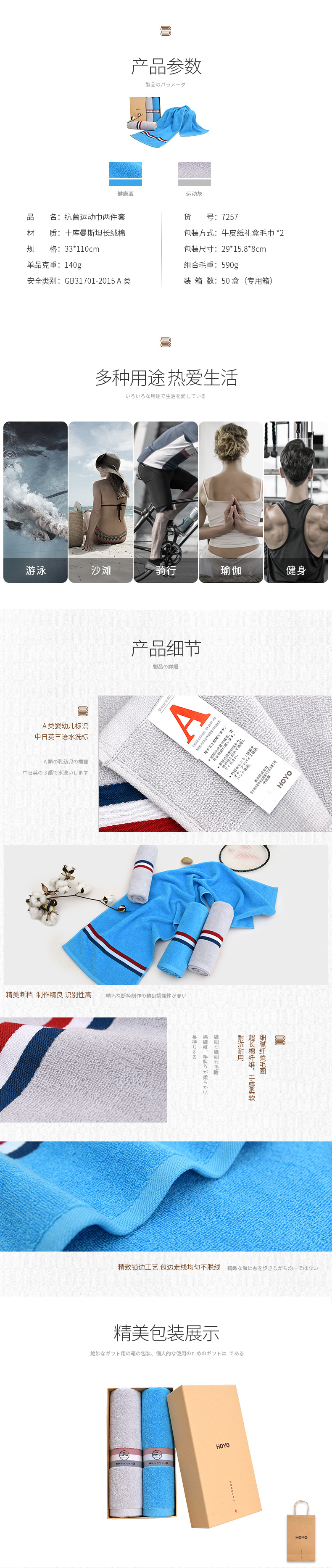 品名:7257-抗菌运动巾两件套 包装方式:牛皮纸礼盒毛巾2条装 规 格:33*110cm 单品克重:140g 颜 色:健康蓝+运动灰 包装尺寸:29*16*8cm 装 箱 数 :50PCS 组合毛重:590g