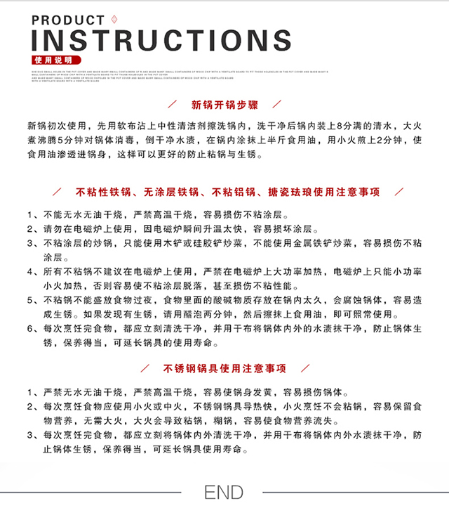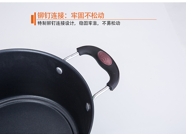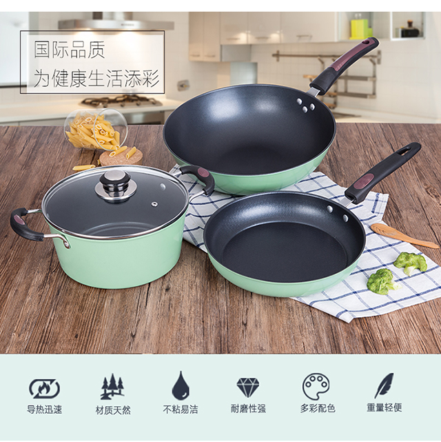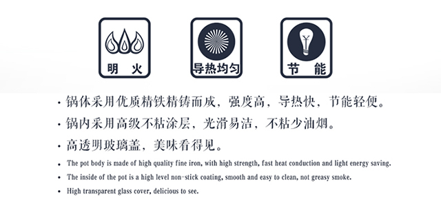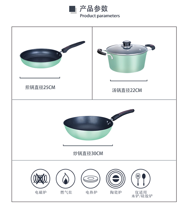 产品型号:HXG-TZ057 产品规格:炒锅30CM/煎锅25CM/汤锅22CM 产品材质:优质精铁 彩盒尺寸(cm):53*14*34cm 外箱尺寸(cm):86.5*54*36 cm 箱体积(m³):0.168456 m³ 装箱数:5pcs 锅体采用优质精铁精铸而成,强度高,导热快,节能轻便。 锅内采用高级不粘涂层,光滑易洁,不粘少油烟。 高透明玻璃盖,美味看得见