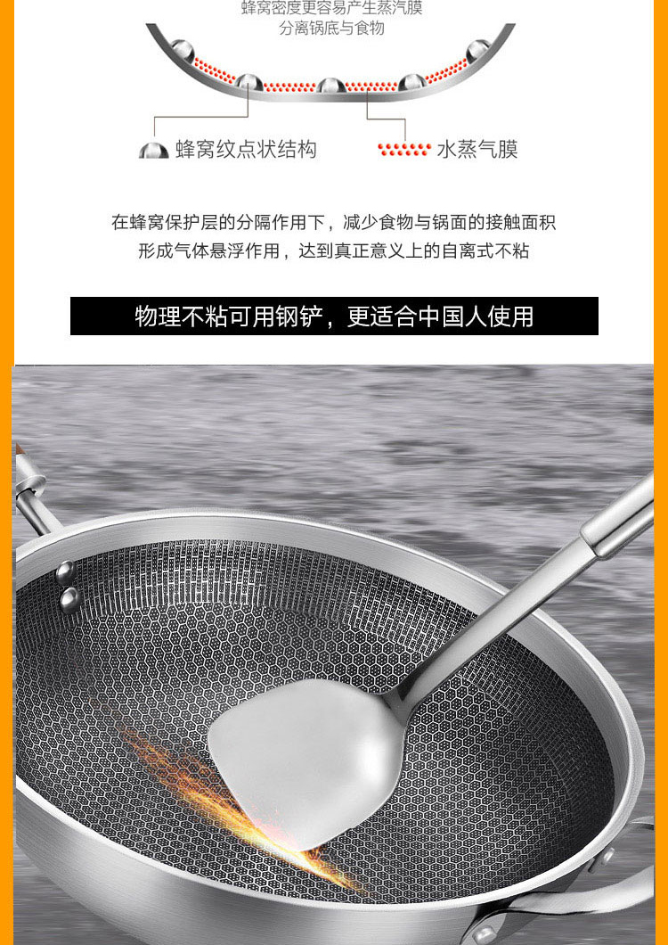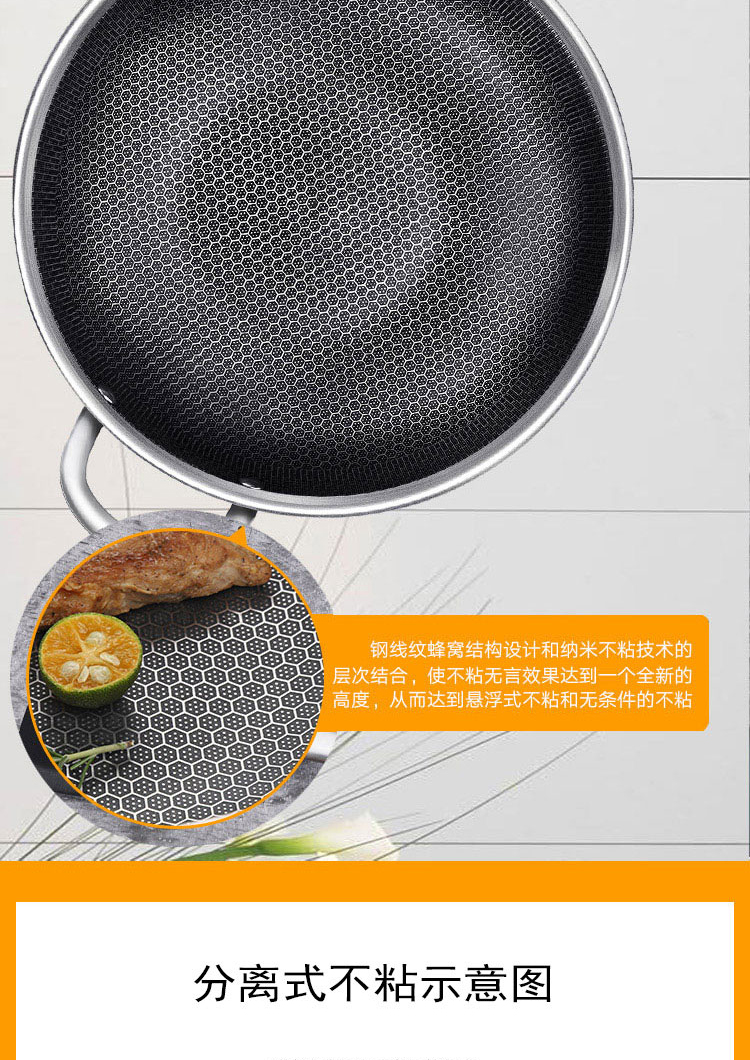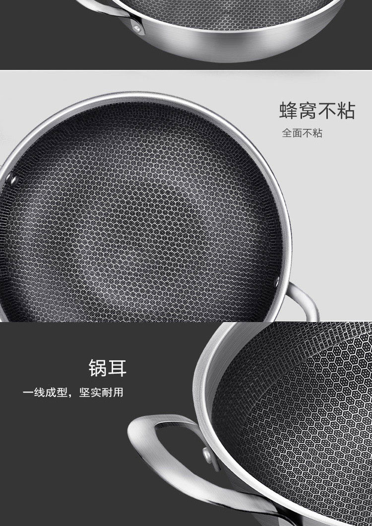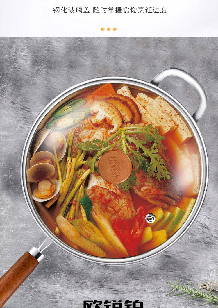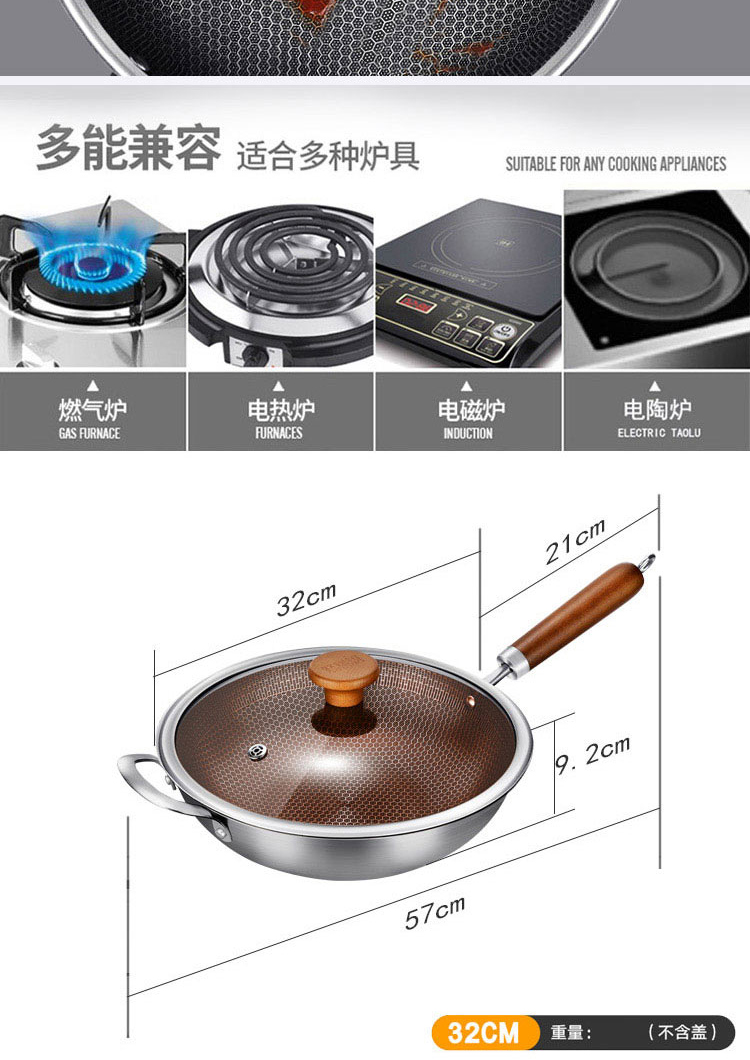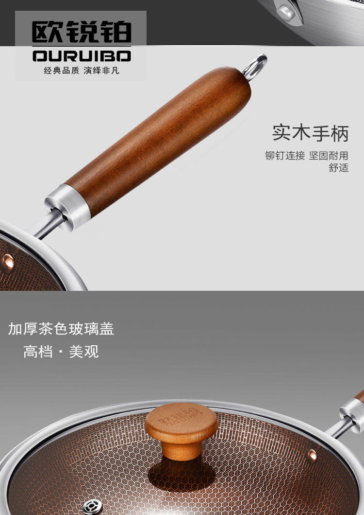 产品特点: 食品级接触430不锈钢,受热快而均匀;健康无涂层,钻石蜂窝纹凹凸有序,有很好的物理不粘效果。茶色高强度钢化玻璃盖,可透视锅内食物,灵活调节烹饪;实木手柄,经典的锅体,带动了古朴自然,又展现科技魅力。