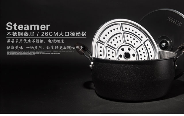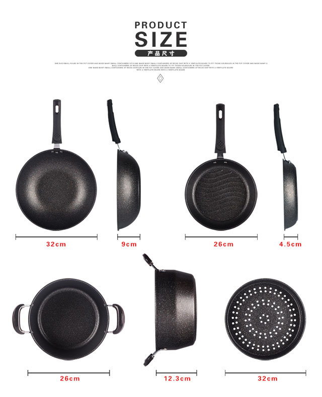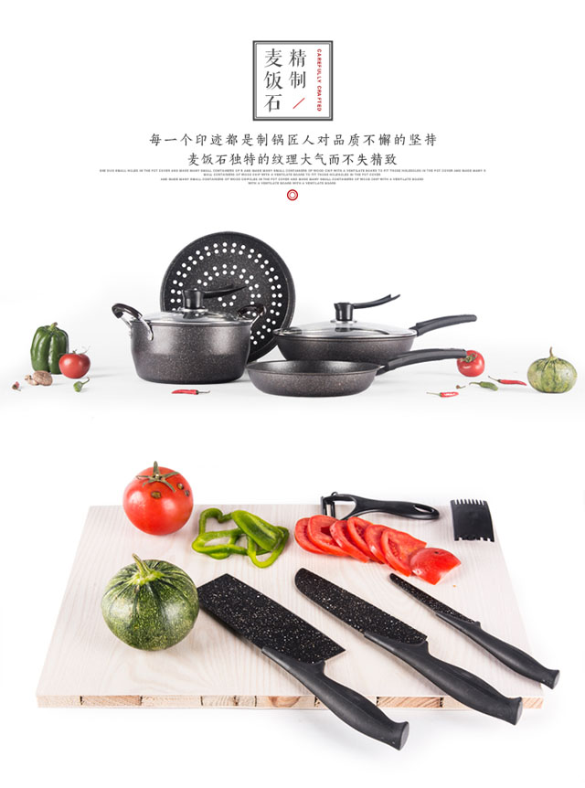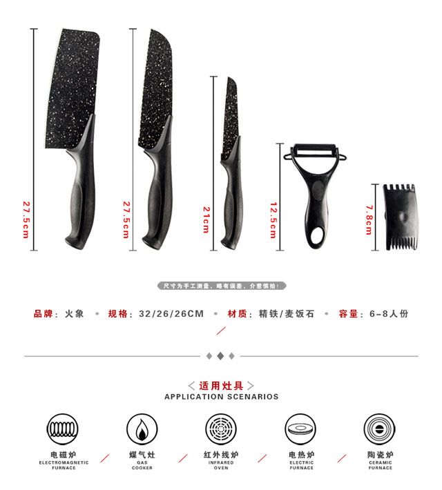 产品规格:炒锅32CM/蒸格32CM/煎锅26CM/汤锅26CM/蒸片24.5CM/切菜刀、锯齿刀、水果刀、削皮器、护手器