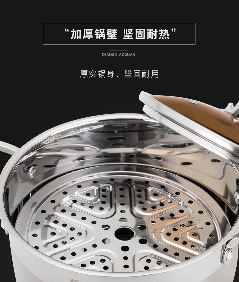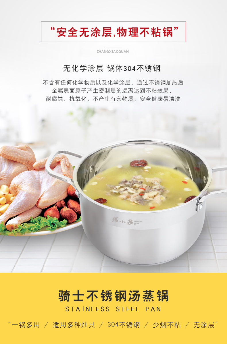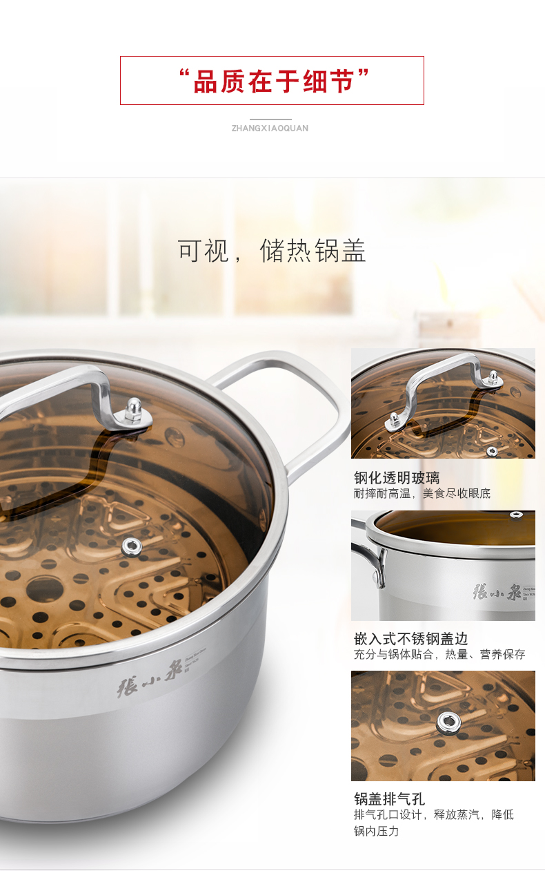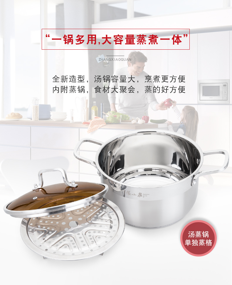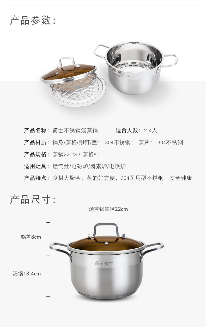 品牌:张小泉 品名:骑士不锈钢汤蒸锅 材质:优质304不锈钢,钢化玻璃盖 规格:22cm 适用:煤气炉、电炉、电陶炉、卤素炉 装箱数:16支/箱 毛重:32.5kg 外箱尺寸: 57cm*56cm*64cm 产品特点: 1、优美流线型设计,造型美观。 2、全304不锈钢,钢化茶色玻璃盖,优质材料,做工精致,完美细节。 3、用途多。可煲汤,煮牛奶,蒸鸡蛋、面包、馒头等。 4、特制奶锅蒸格。 5、不挑灶具,适合各类灶具。