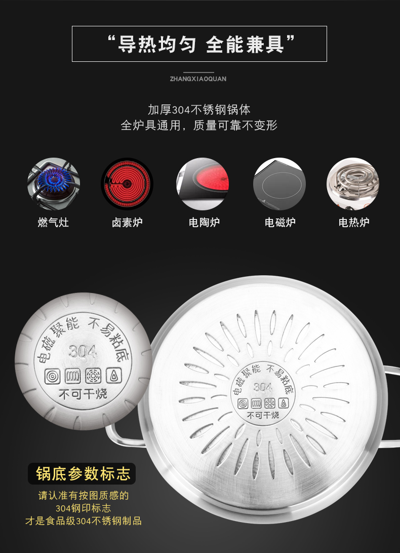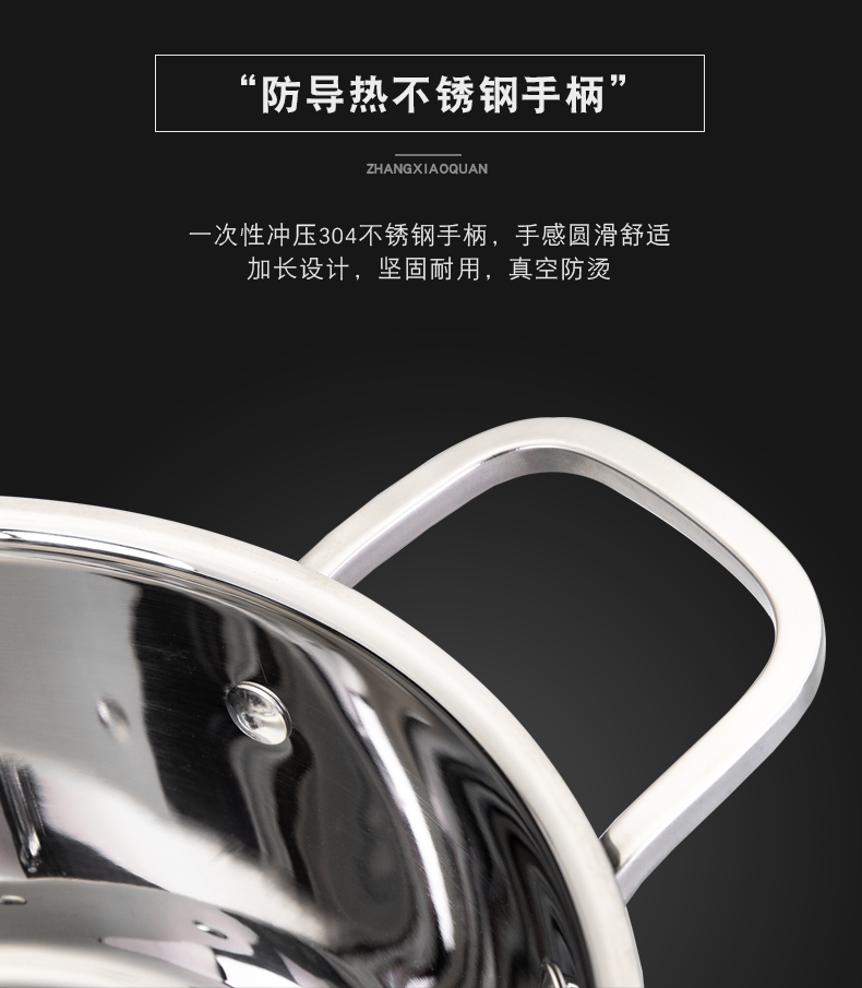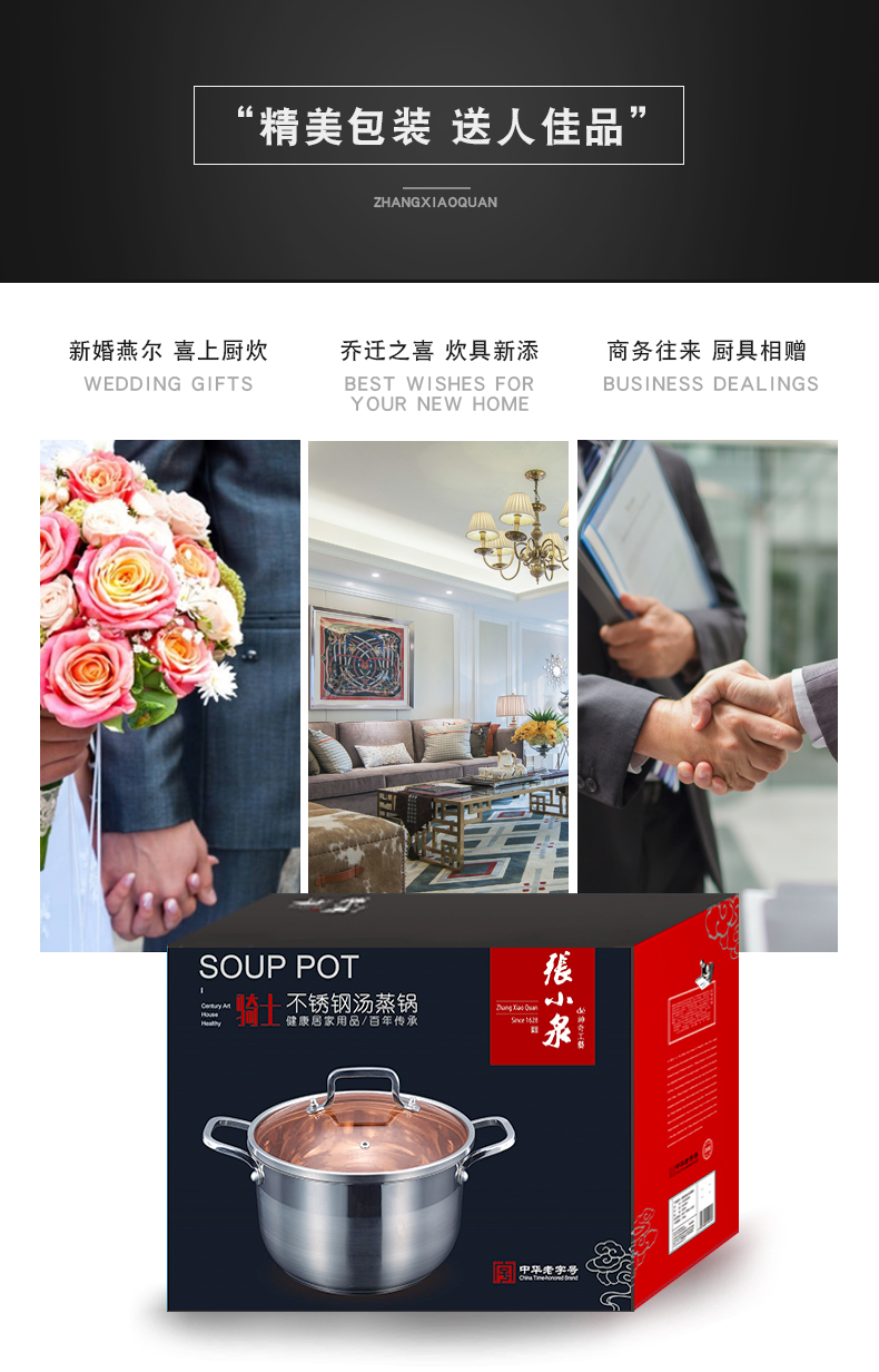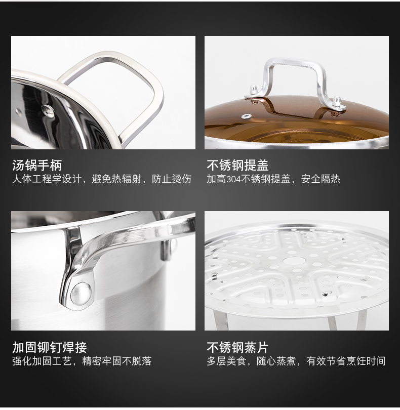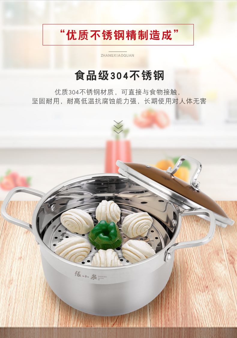 品牌:张小泉 品名:骑士不锈钢汤蒸锅 材质:优质304不锈钢,钢化玻璃盖 规格:22cm 适用:煤气炉、电炉、电陶炉、卤素炉 装箱数:16支/箱 毛重:32.5kg 外箱尺寸: 57cm*56cm*64cm 产品特点: 1、优美流线型设计,造型美观。 2、全304不锈钢,钢化茶色玻璃盖,优质材料,做工精致,完美细节。 3、用途多。可煲汤,煮牛奶,蒸鸡蛋、面包、馒头等。 4、特制奶锅蒸格。 5、不挑灶具,适合各类灶具。