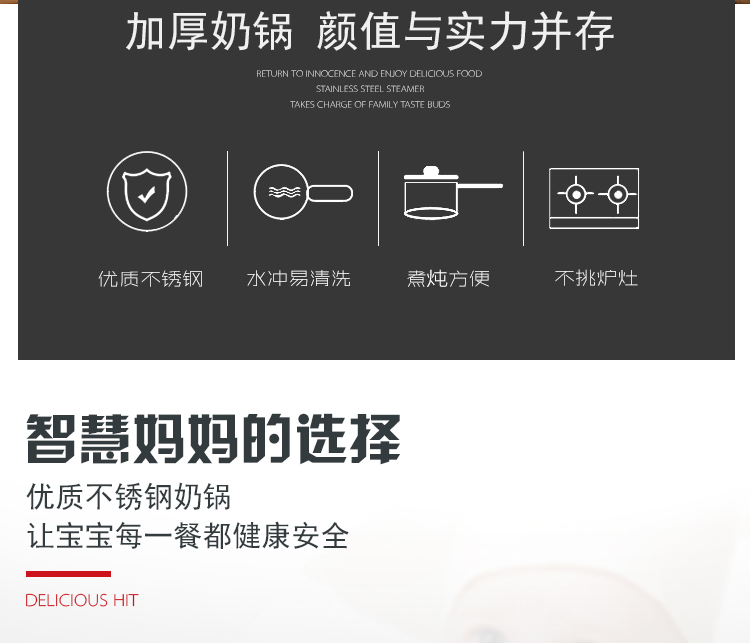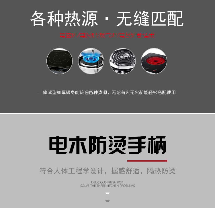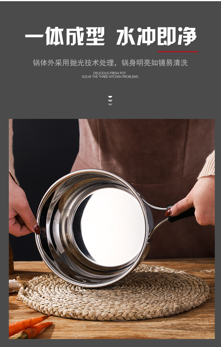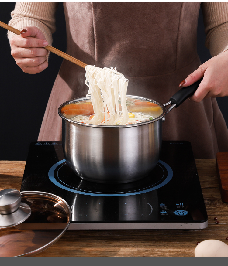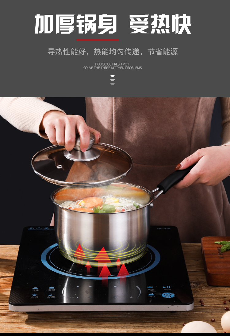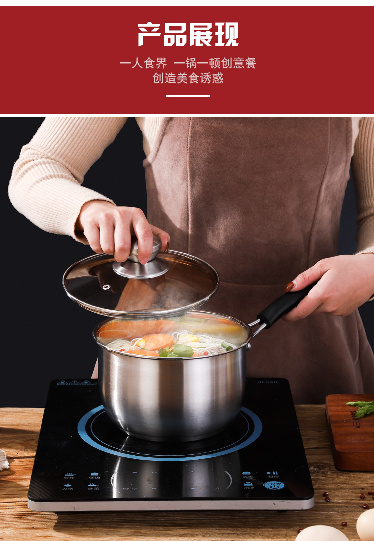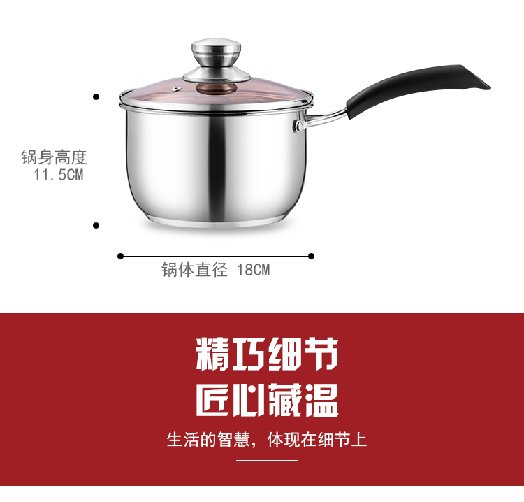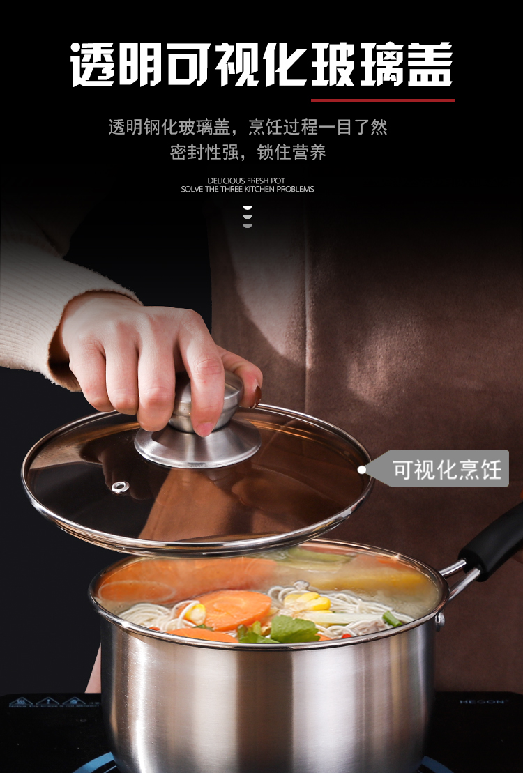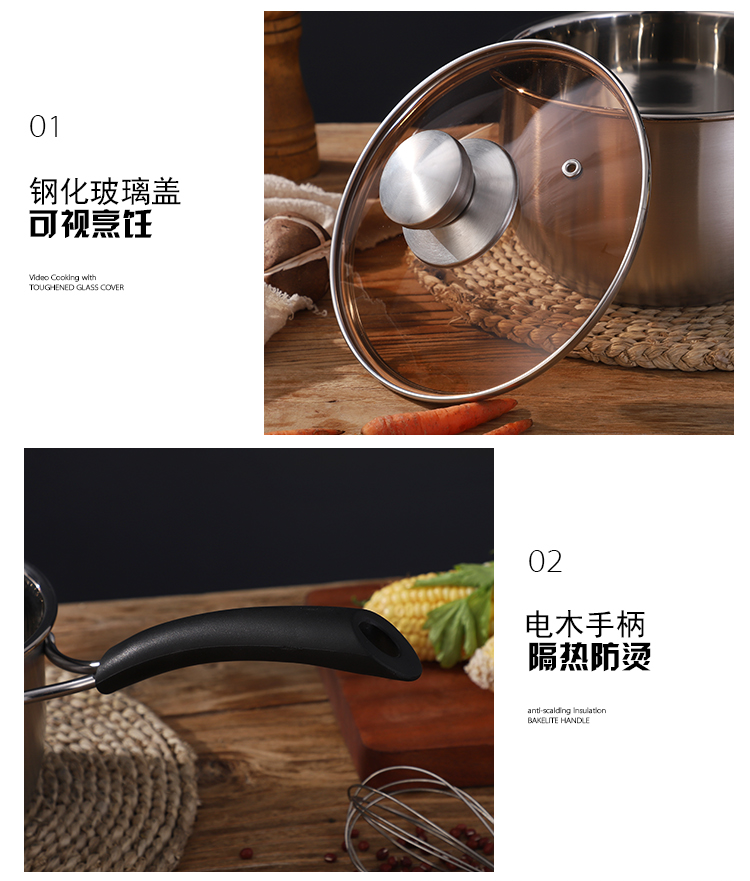 规格:18cm 材质:优质不锈钢 装箱数:16套 产品说明: 1.采用优质不锈钢精制而成。 2.外观采用精抛技术原理,金属质感明亮,有效防止水渍 残留,便于清理。 3.电木防烫人性化手柄,隔热防烫,安全方便。 4.透明玻璃盖设计,可以全程观察蒸煮情况,密封性极佳. 5.加厚锅体,导热性能好,热能均匀传递,节省能源。 6.适用于蒸汽炉、天然气炉、电炉、电磁炉等,节能省时 环保经济。