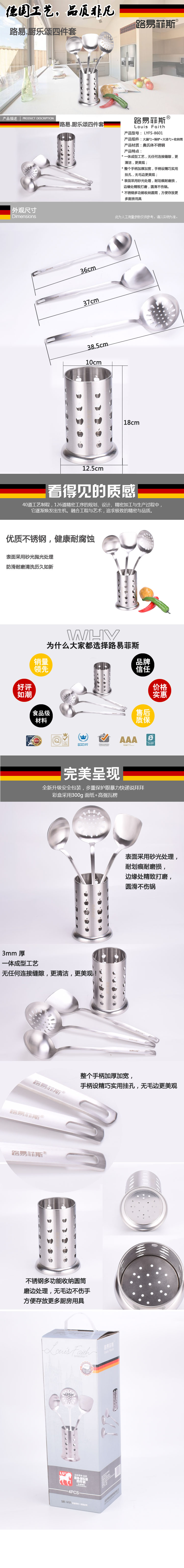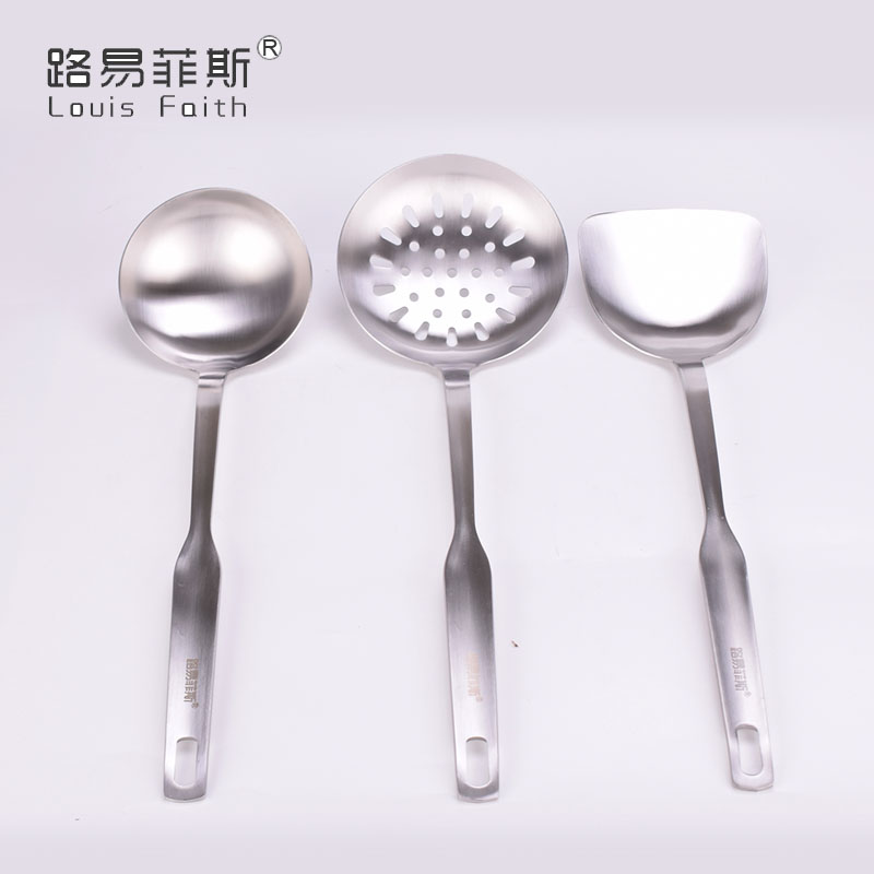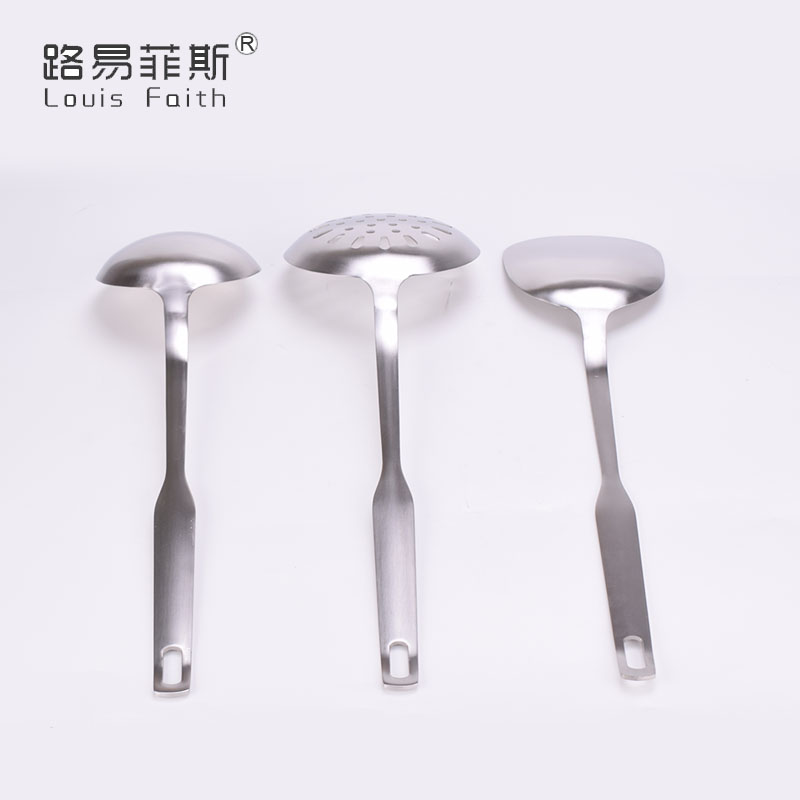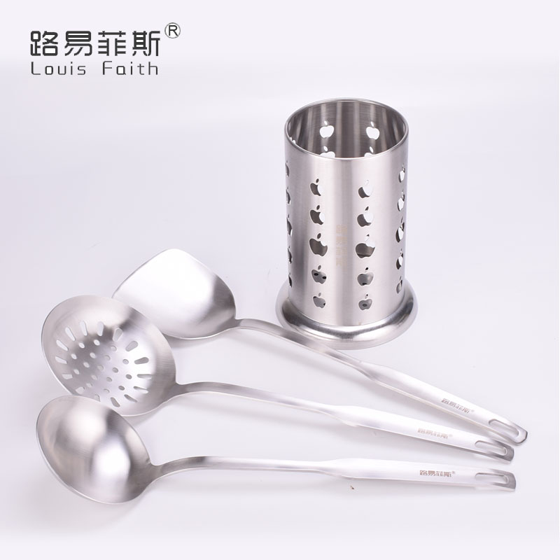 组件:大漏勺+锅铲+大汤勺+收纳筒 型号:LYFS-8601 材质:奥氏体不锈钢 装箱数:20套/箱 彩盒尺寸:130*130*394CM 主要特点: ·一体成型工艺,无任何连接缝隙,更清洁,更美观; ·整个手柄加厚加宽,手柄设精巧实用挂孔,无毛边更美观; ·表面采用砂光处理,耐划痕耐磨损,边缘处精致打磨,圆滑不伤锅。 . 不锈钢多功能收纳圆筒,方便存放更多厨房用具。