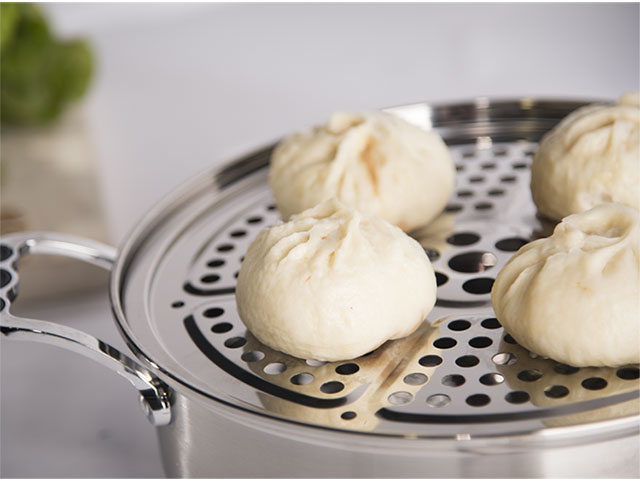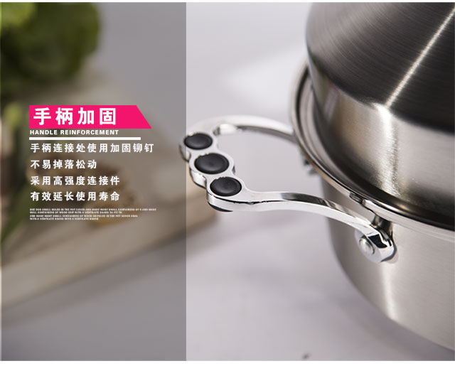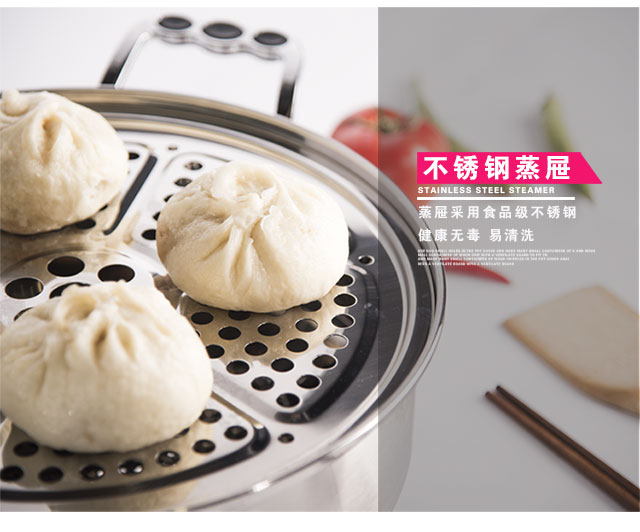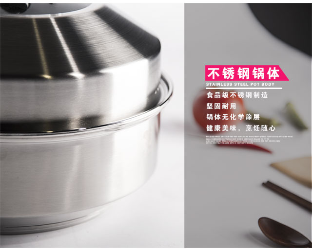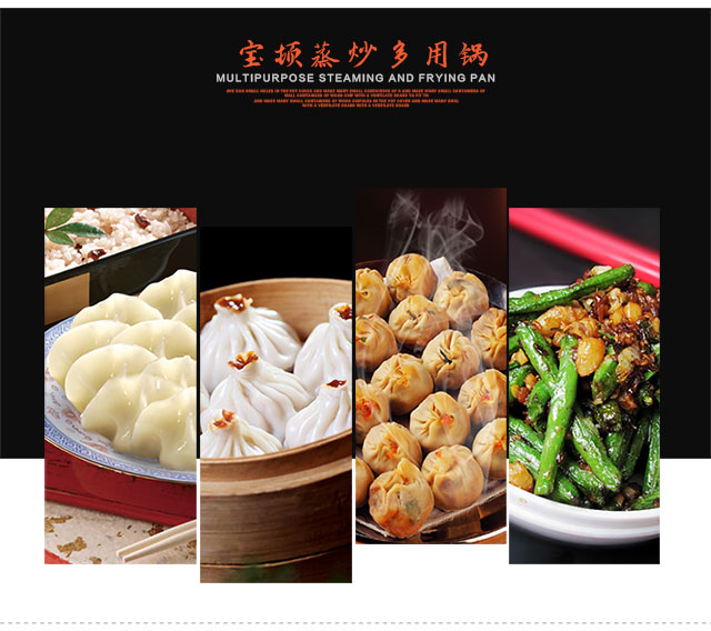 一锅全能,蒸、煮、炖、焖、涮,导流蒸片,防串味、防冷 凝水滴入菜里,优质不粘锅底,有效防止烹饪
