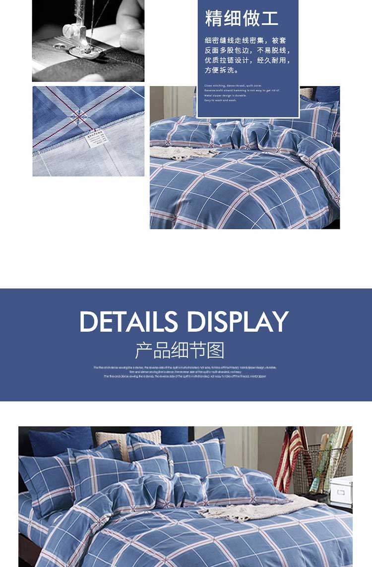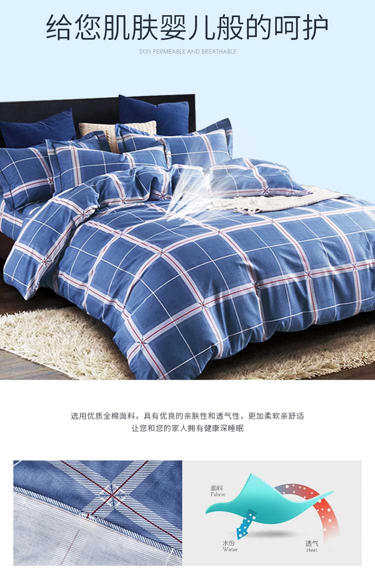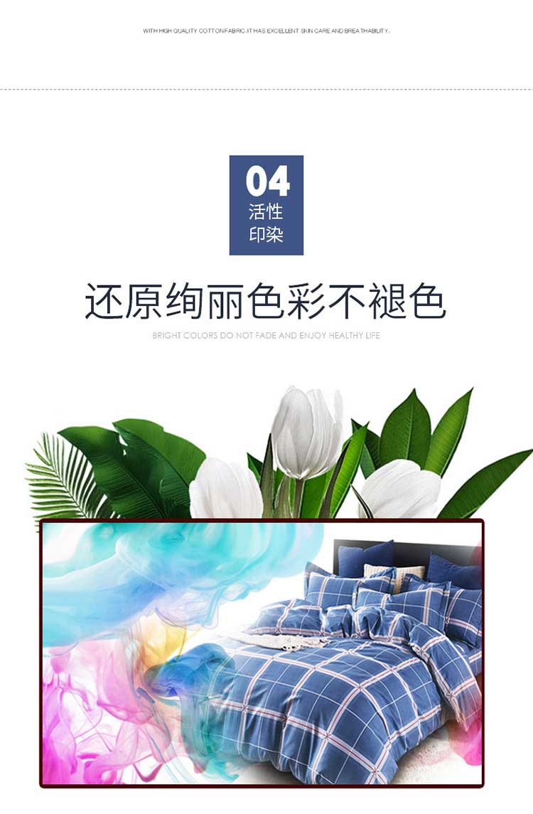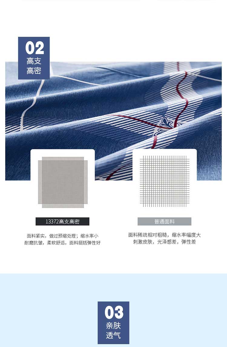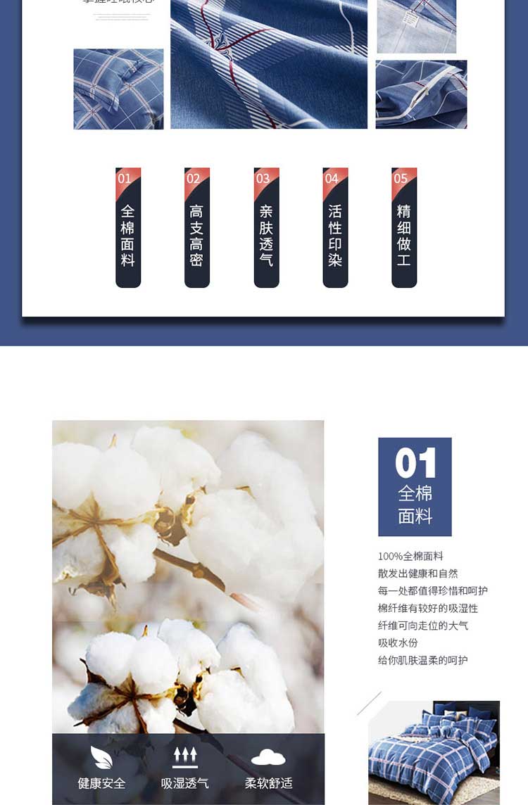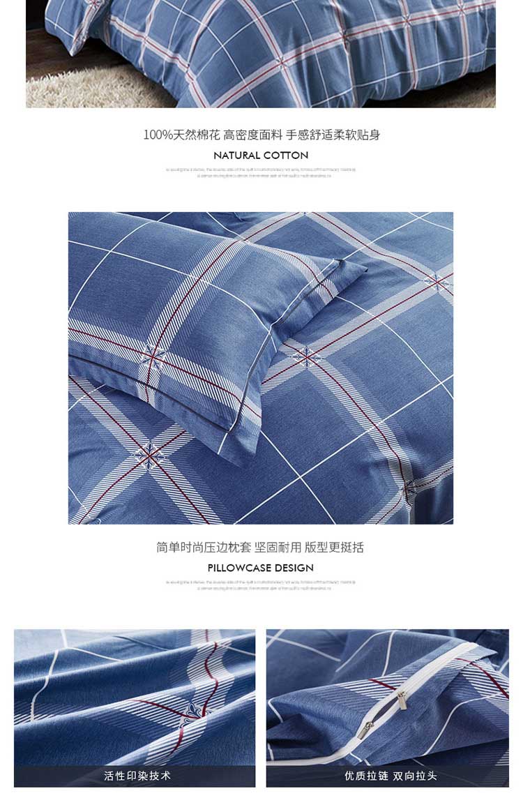 产品规格: 被套:200*230cm 床单:250*250cm 枕套:48*74cm*2 产品材质: 棉100% 工 艺:活性印染 包装尺寸: 52*38*10.5cm 外箱尺寸: 66*53*43.5cm 毛重净重: 4.1kg/2.6kg 装 箱 数: 6套 ◆ 高支高密,足支足密; ◆ 亲肤面料安全健康; ◆ 透气排汗亲肤舒适 ◆ 保暖性好,牢牢锁住温度; ◆ 精细做工,严格把握品质; ◆ 活性印染工艺,色牢度高,不易缩水。