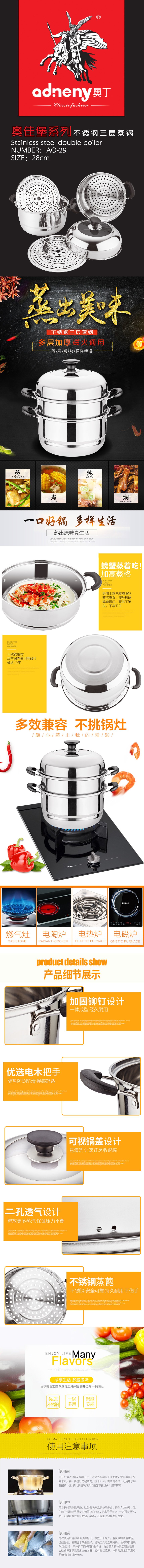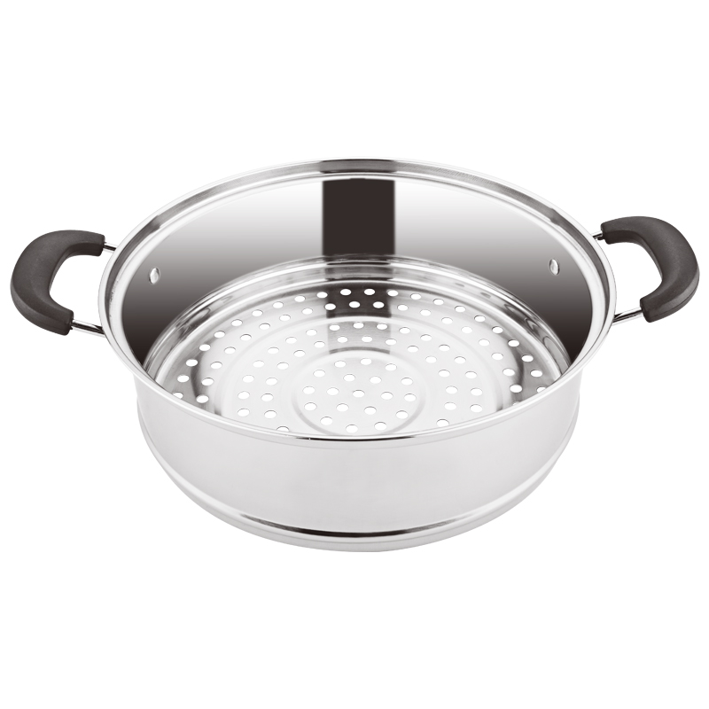 规格:28cm 材质:优质不锈钢 装箱数:8套 产品说明: 1.精选优质不锈钢精制而成,内外精细抛光。 2.优质电木手柄设计、隔热防烫、安全耐用。 3.可视组合盖设计,聚水、保汽、保持食物原味。 4.多层设计,一锅多用、可蒸煮不同食物