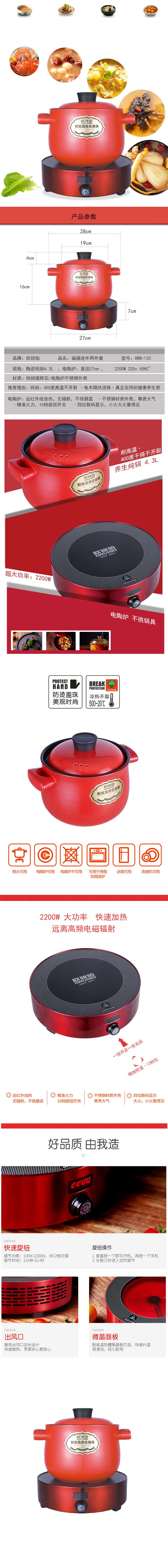 品牌:欧锐铂 品名:福禧连年两件套 型号:ORB-133 规格:陶瓷炖锅4.3L 电陶炉直径27cm,2200W 220v 50HZ~ 材质:炖锅锂辉石/电陶炉不锈钢外壳 装箱:4套/箱 统一零售价:1199元 推荐理由: 炖锅 ● 400度高温不开裂 ● 电木隔热顶珠 ●真正实用的健康养生煲 电陶炉 ● 远红外线加热,无辐射,不挑器皿 ● 不锈钢材质外壳,尊贵大气 ● 火力,10档旋扭开关 ● 四位数码显示,小火大火看得见
