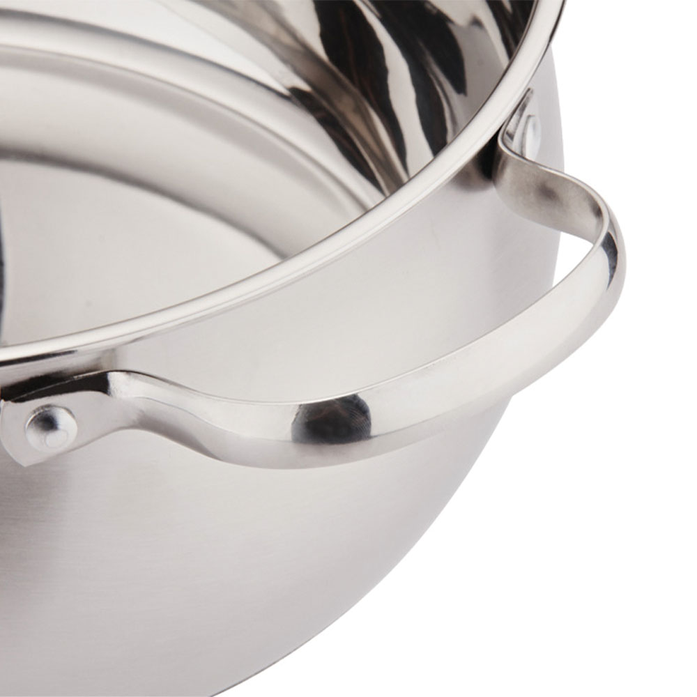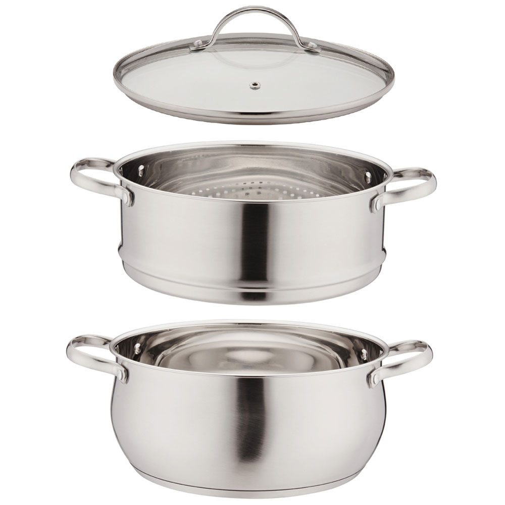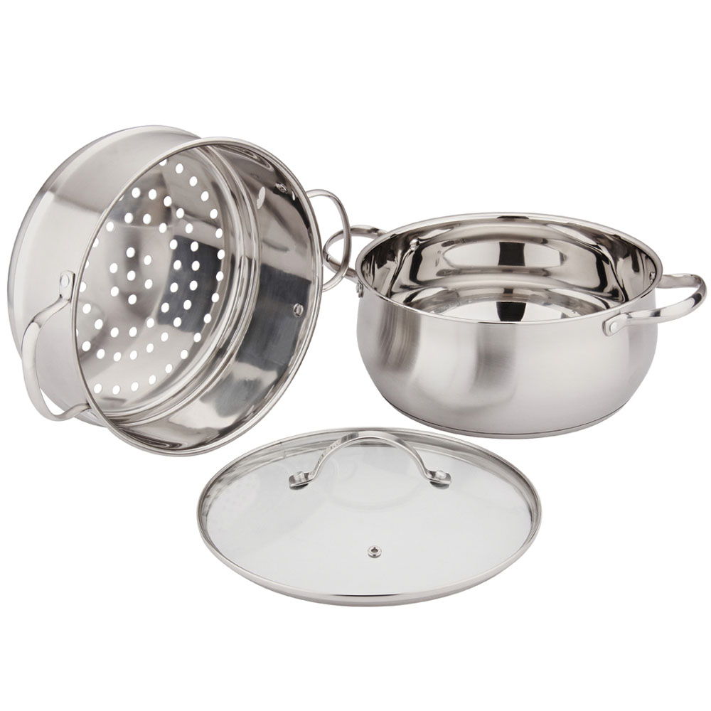 规格:24cm 材质:食品级304SUS 装箱数:8套 产品说明: 1.采用优质食品级304#不锈钢精制而成。 2.高强度钢化玻璃盖。耐热性好,可视烹饪。 3.人体工程学隔热手柄。易取易放,蒸的舒心。 4.独立加高蒸格,可拆卸式设计,以存储,灵活方便,容量大。 5.三层复合底,导热性能好,热能均匀传递,节省能源。 6.一锅多用,可蒸煮不同食物。