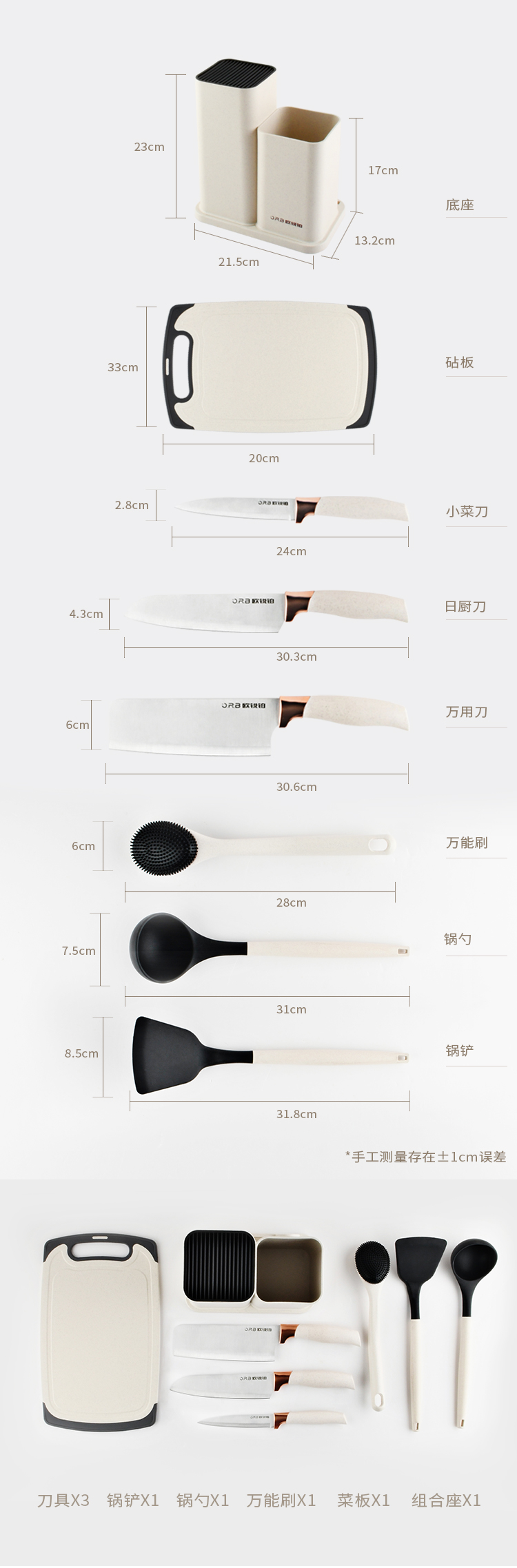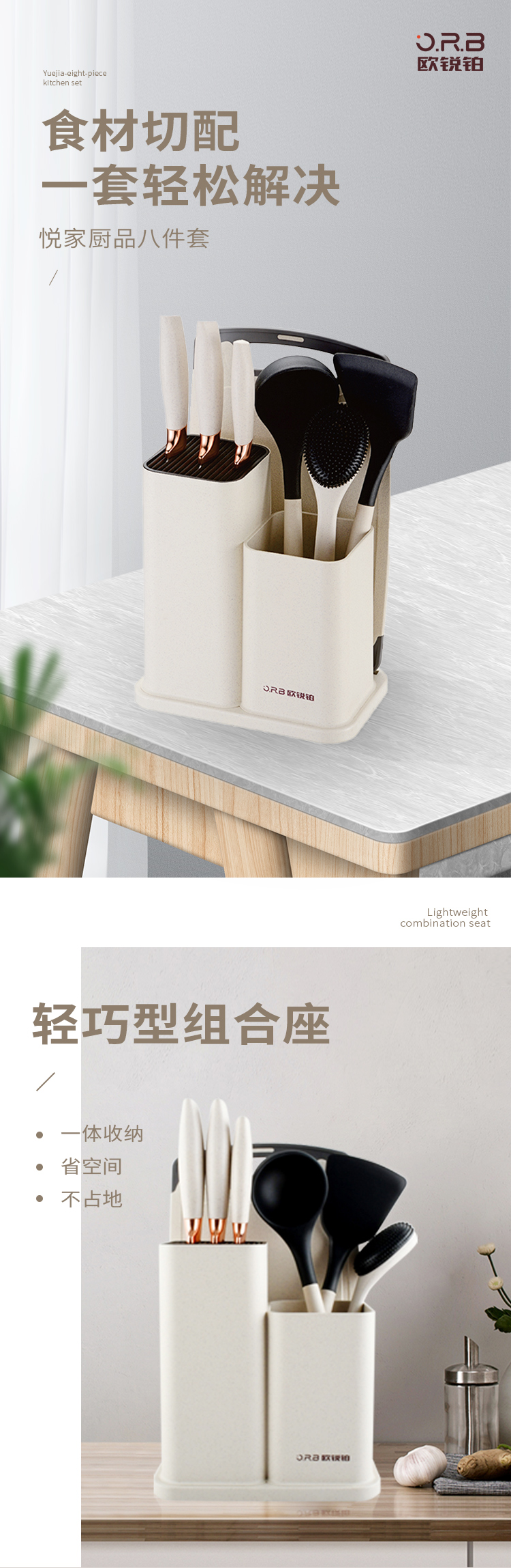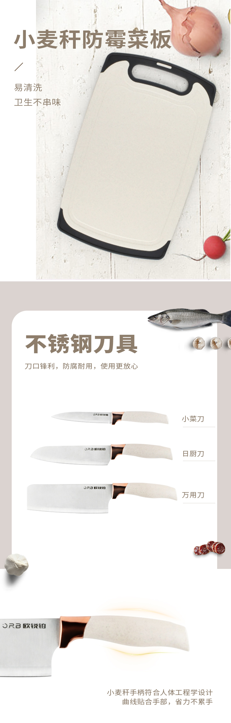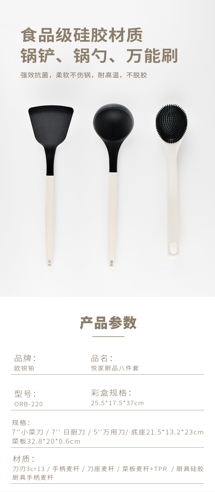 产品优点: ● 厨品8件套装,功能齐全,食材切配,一套轻松解决。 ● 食品级硅胶材质锅铲、锅勺、万能刷,强效抗菌,柔软不伤锅,耐高温,不脱胶。 ● 不锈钢刀具,刀口锋利,防腐耐用,使用更放心。小麦秆手柄符合人体工程学设计,曲线贴合 手部,省力不累手。 ● 小麦秆防霉菜板,易清洗,卫生不串味。 ● 锈钢刀具,刀口锋利,防腐耐用,使用更放心。 ● 轻巧型组合座,一体收纳,省空间,不占地。