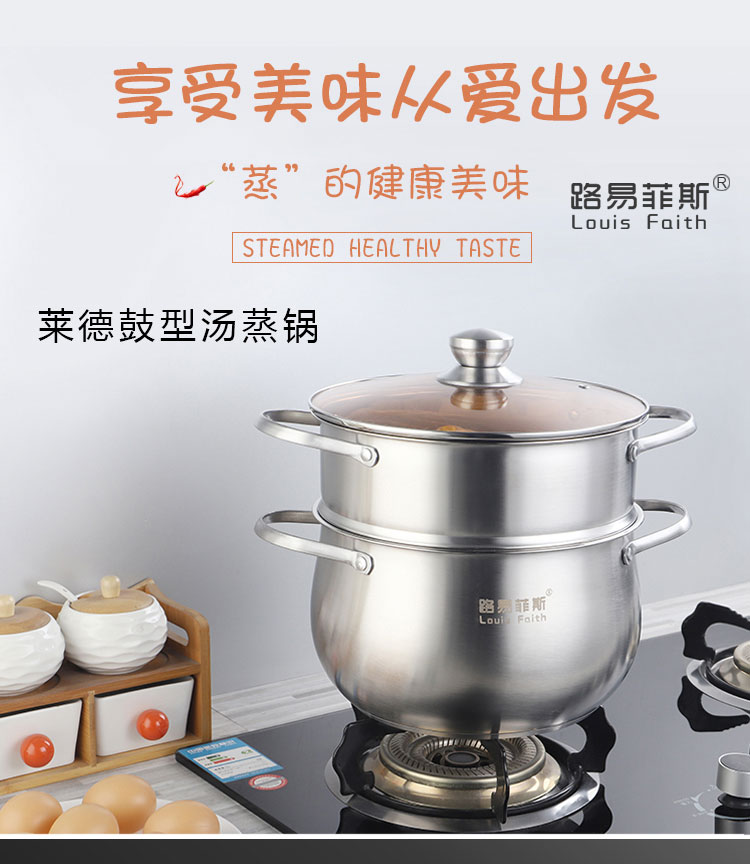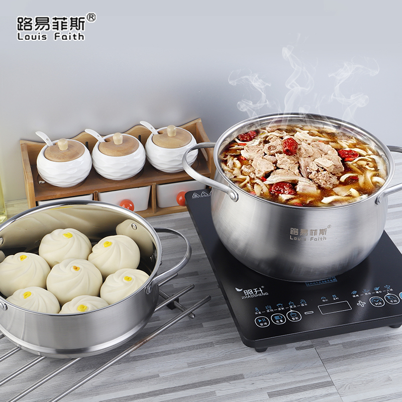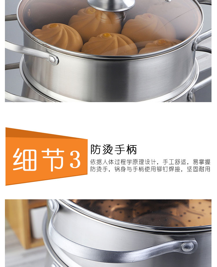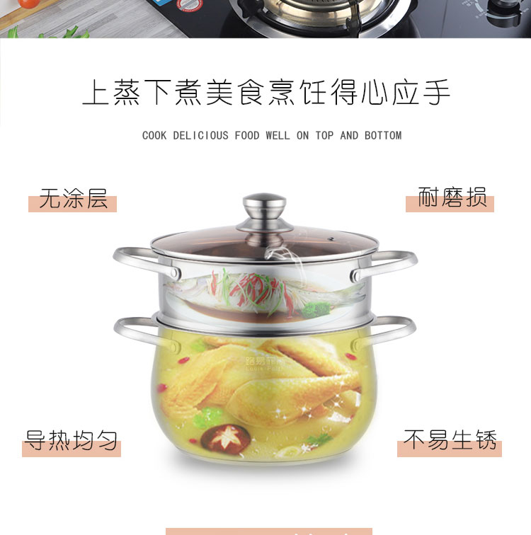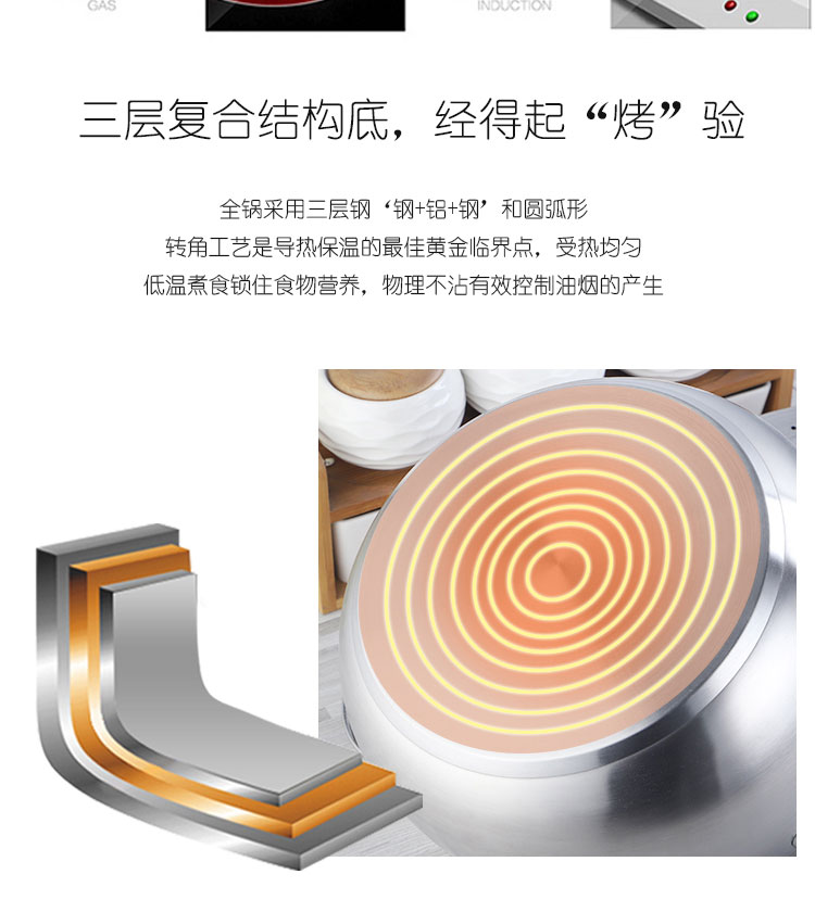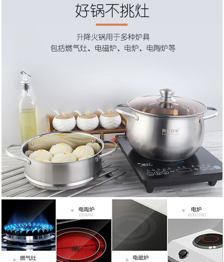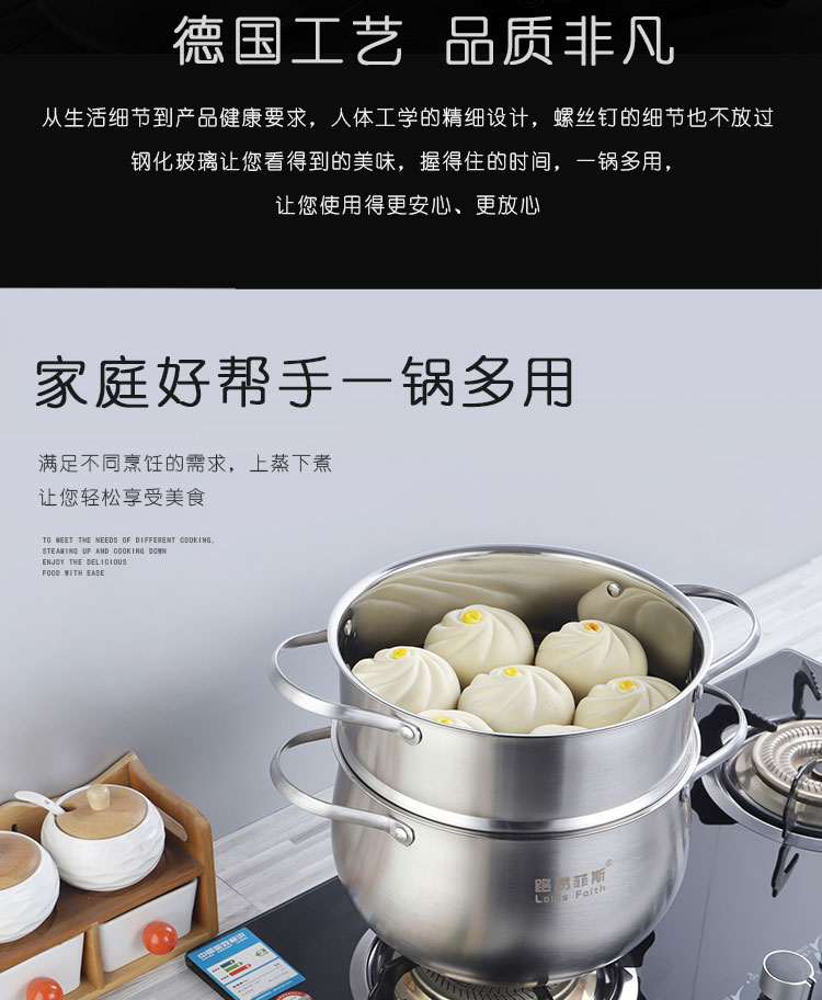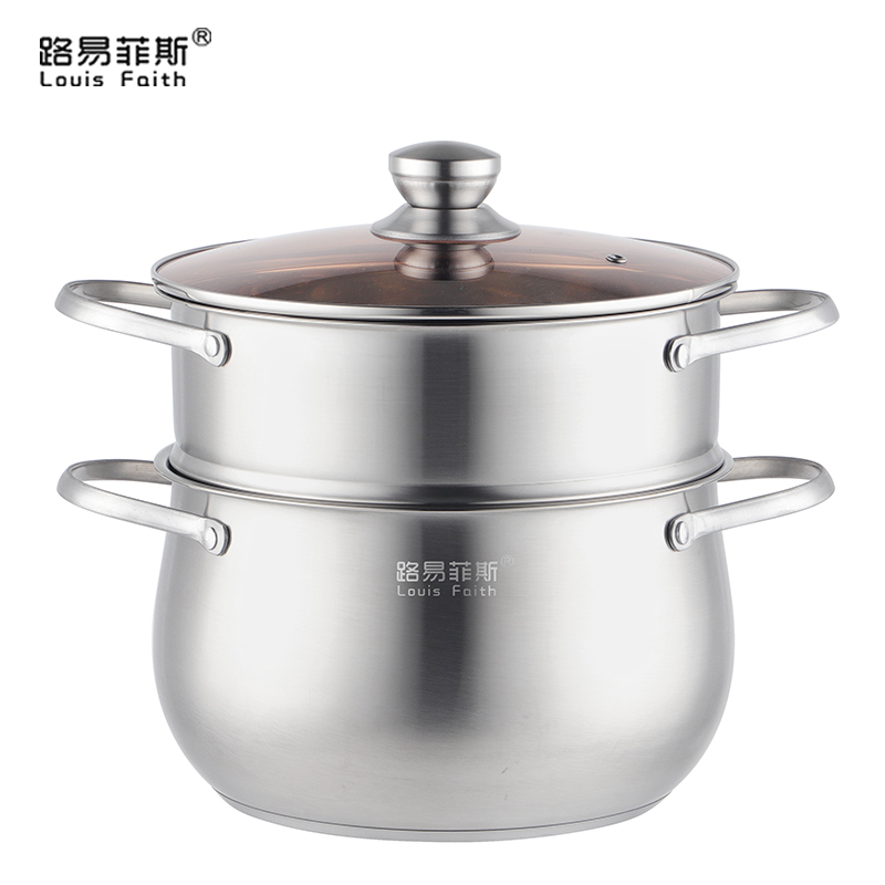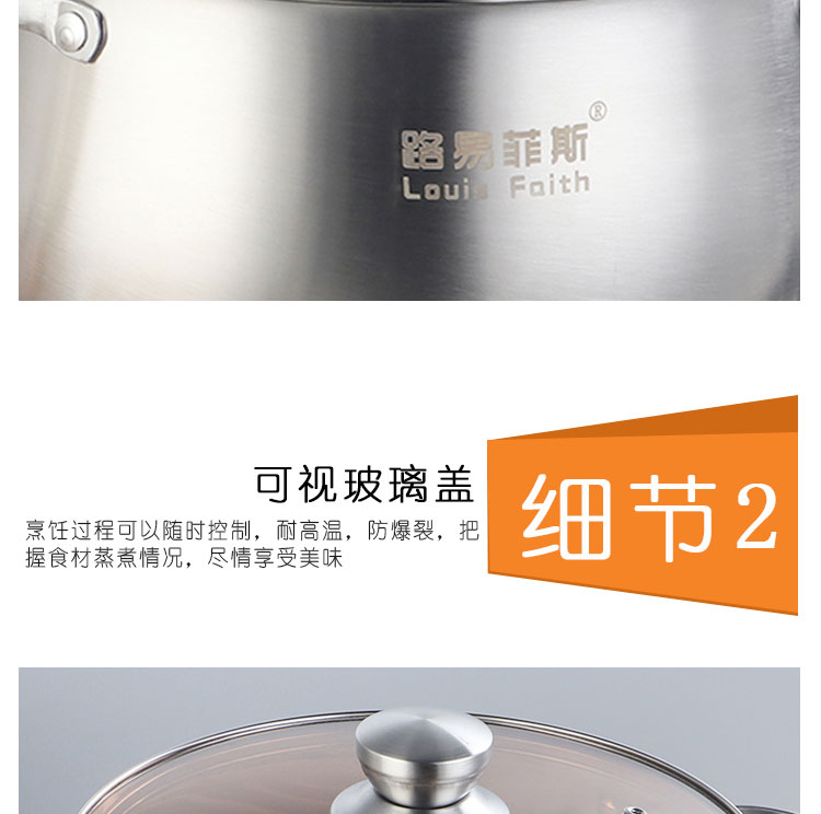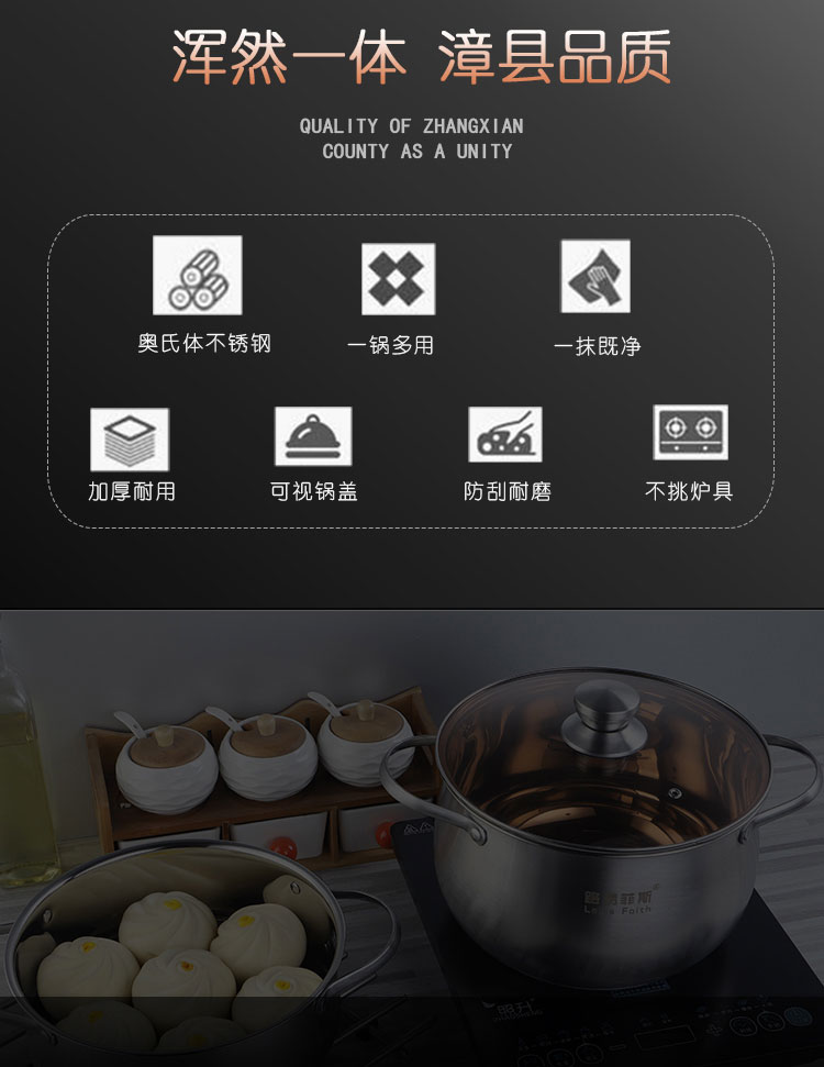主要特点: 1.精工打磨抛光,锅内、外光滑如镜,即高档美观外,便于清洗于一身; 2.可视钢化茶色玻璃盖,时尚美观实用,对锅内烹饪美食一目了然,方便操作。‘ 3. 属于奥氏体型不锈钢, 食品接触用; 4. 三层加厚复合底,导热均匀, 防粘锅; 5. 电磁炉、液化、电炉等通用方便。