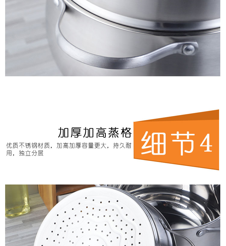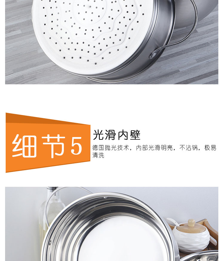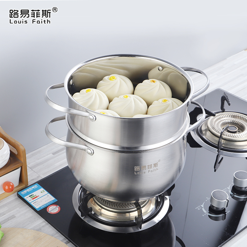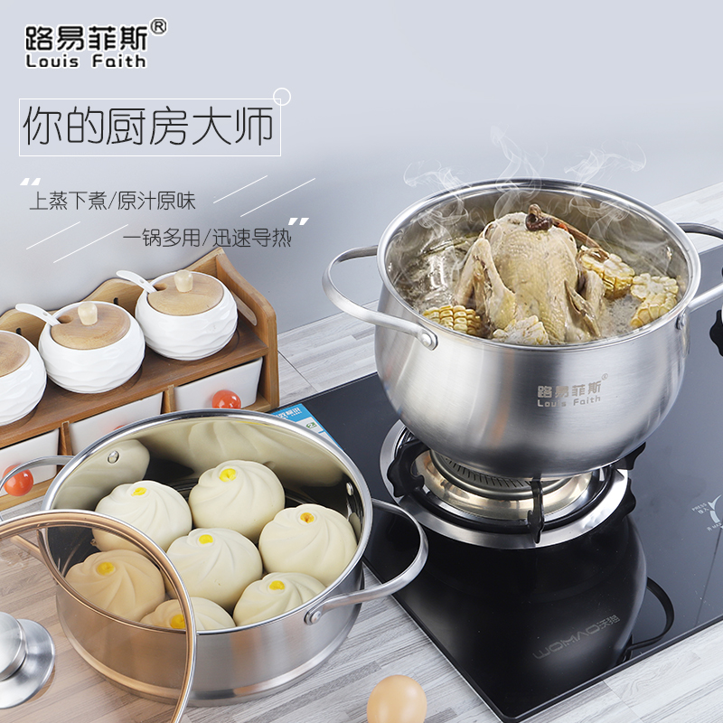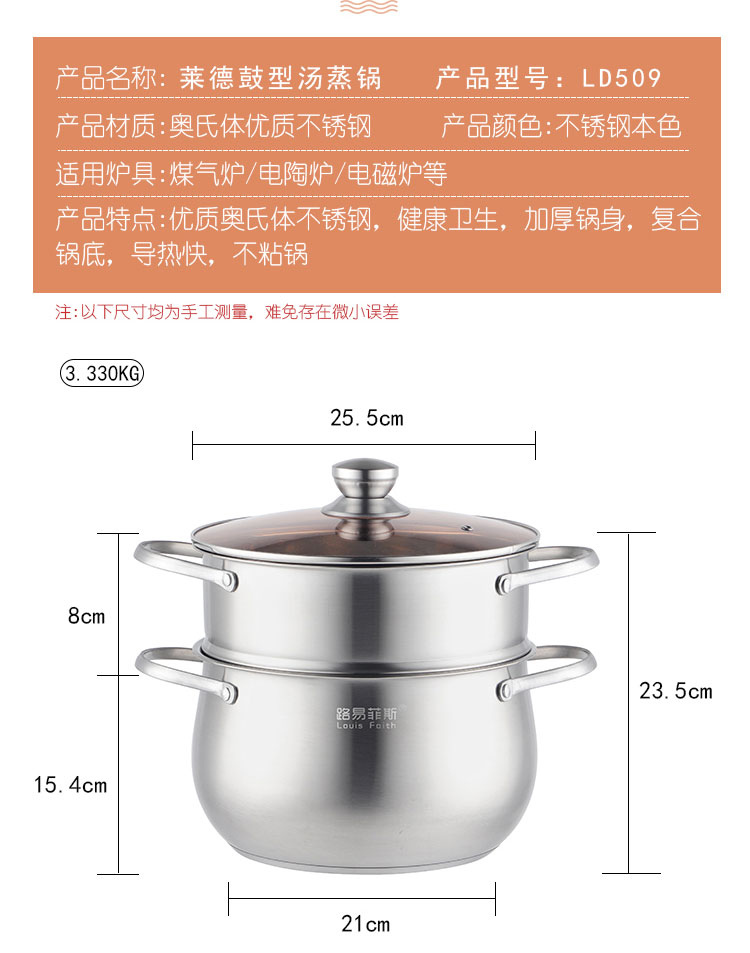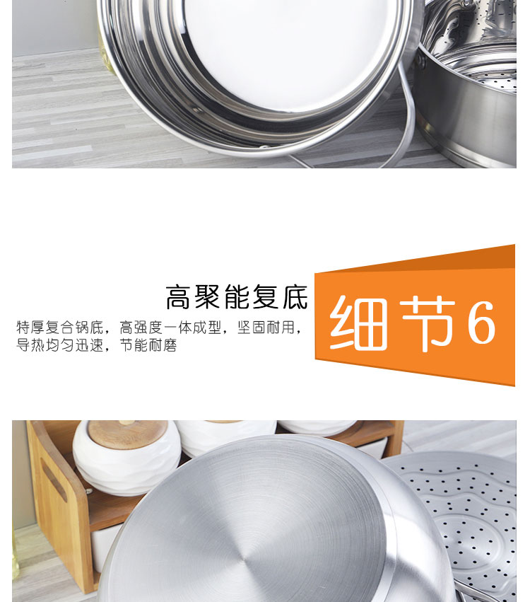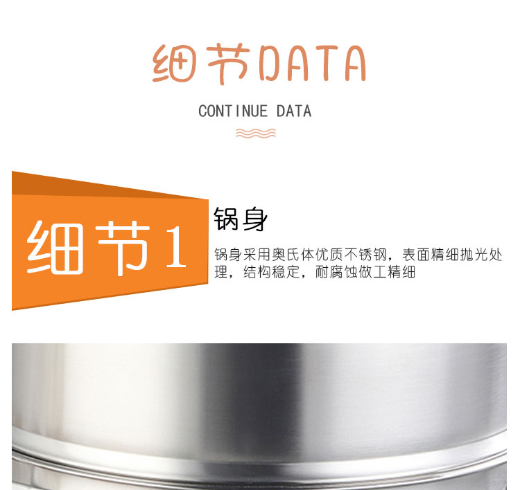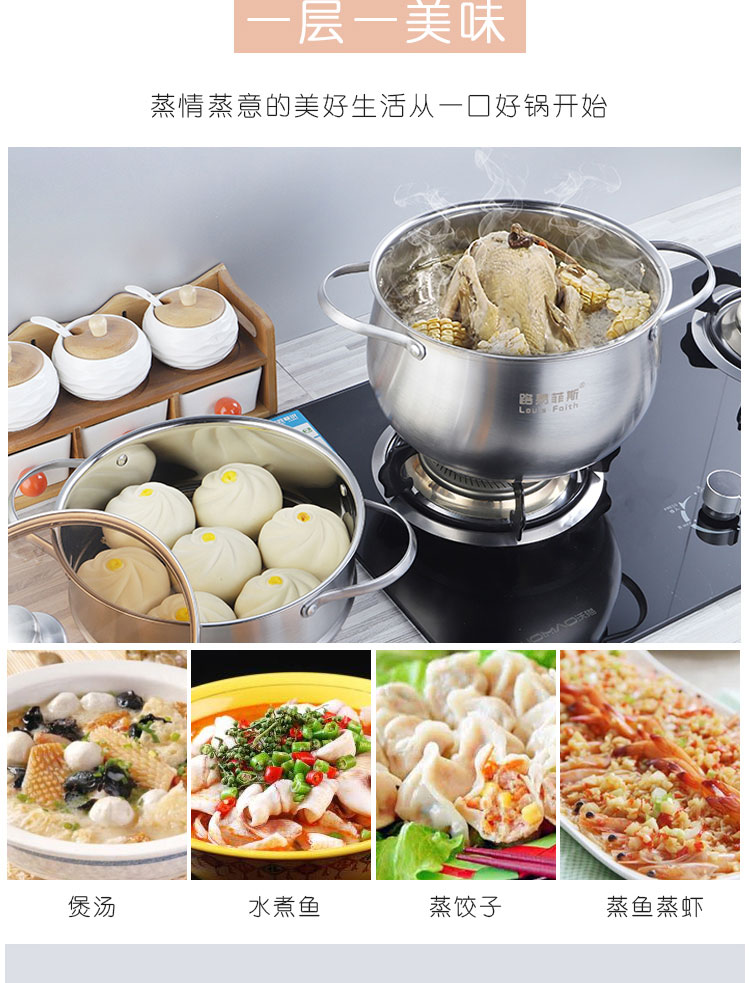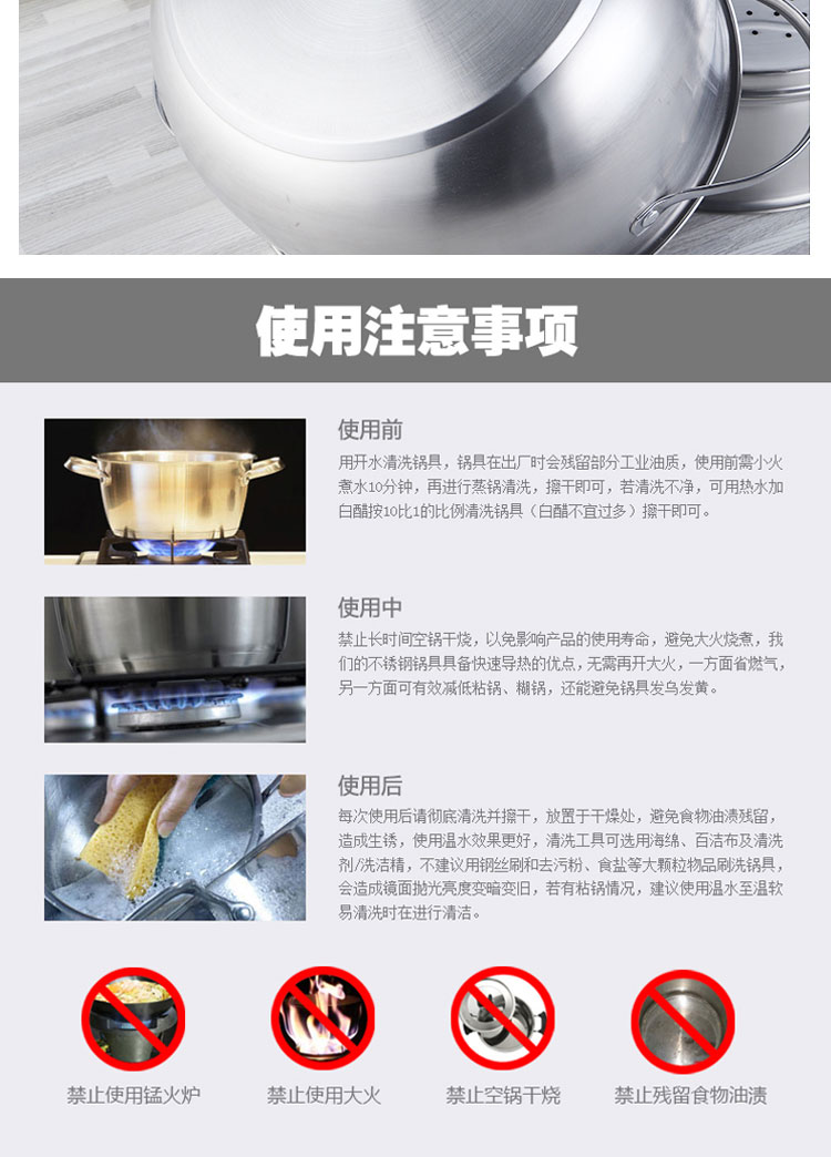 主要特点: 1.精工打磨抛光,锅内、外光滑如镜,即高档美观外,便于清洗于一身; 2.可视钢化茶色玻璃盖,时尚美观实用,对锅内烹饪美食一目了然,方便操作。‘ 3. 属于奥氏体型不锈钢, 食品接触用; 4. 三层加厚复合底,导热均匀, 防粘锅; 5. 电磁炉、液化、电炉等通用方便。