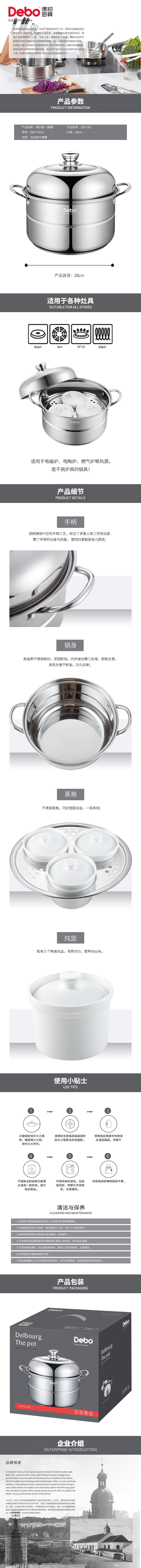 产品名称:德尔堡(汤锅) 彩盒尺寸: 290X241X294mm 产品型号:DEP-361 货号:DEP-T361C 口径:28cm 装箱数:6套/件 全国统一零售价:538.00元