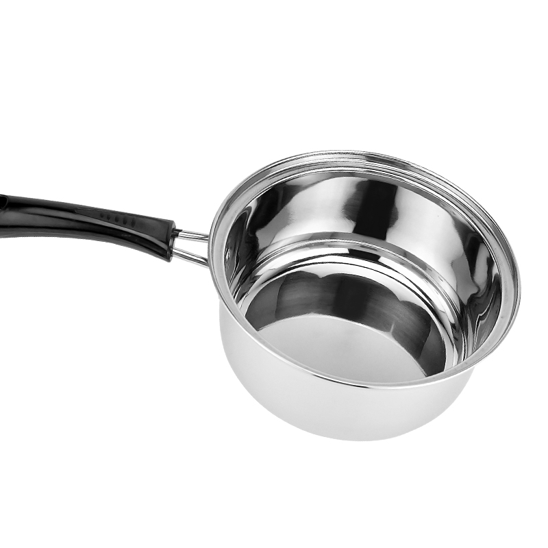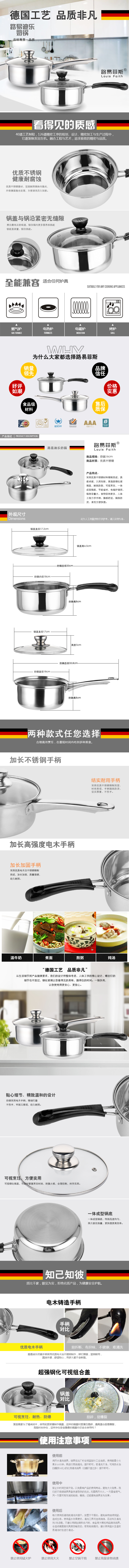 组件:16cm奶锅 型号:LYFS-DL8061 厚度:0.38MM 材质:优质不锈钢 装箱数:18套/箱 主要特点: 1、采用国际标准不锈钢板材,精工制作,持久耐用,导热均匀,镜面抛光,易清洗 2、手柄:优质不锈钢+电木,烹饪时拿捏舒服,隔热防烫,经久耐用。 3、组合全能,可同时热牛奶、煮汤、烧水,炒菜等样样都行,满足现代家庭的多样需求。 4、高边线条设计防溢,可放心安全使用。 5、可视钢化浮法玻璃盖,美味一目了然。 6、电磁炉、液化、电炉等通用方便