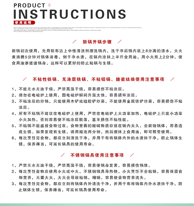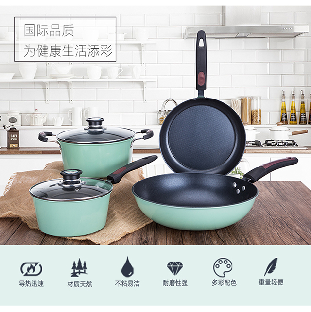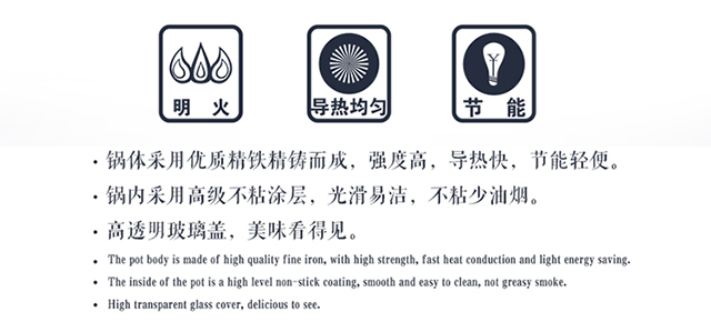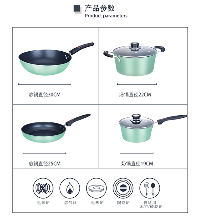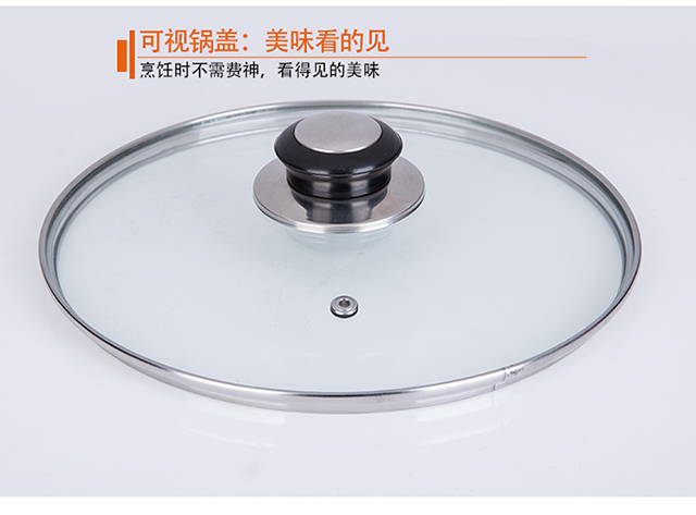 产品型号:HXG-TZ063 产品规格:炒锅30CM/煎锅25CM/汤锅22CM/奶锅19CM 产品材质:优质精铁 彩盒尺寸(cm):55.7*13.6*36cm 外箱尺寸(cm):86.5*54*36 cm 箱体积(m³):0.168456 m³ 装箱数:5pcs 锅体采用优质精铁精铸而成,强度高,导热快,节能轻便。 锅内采用高级不粘涂层,光滑易洁,不粘少油烟。 高透明玻璃盖,美味看得见
