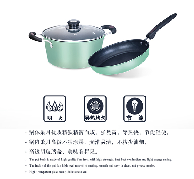 产品型号:HXG-TZ058 产品规格:煎锅25CM/汤锅22CM 产品材质:优质精铁 彩盒尺寸(cm):45*13*26cm 外箱尺寸(cm): 68*54*47 cm 箱体积(m³):0.172584m³ 装箱数:6pcs 锅体采用优质精铁精铸而成,强度高,导热快,节能轻便。 锅内采用高级不粘涂层,光滑易洁,不粘少油烟。 高透明玻璃盖,美味看得见。