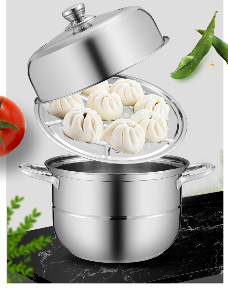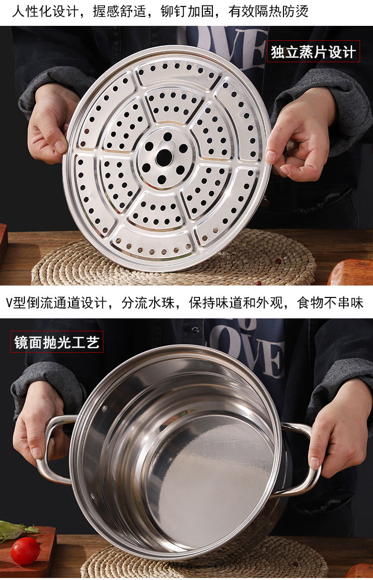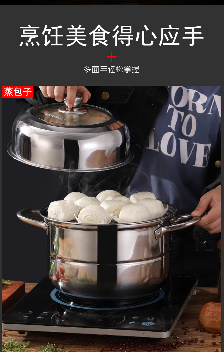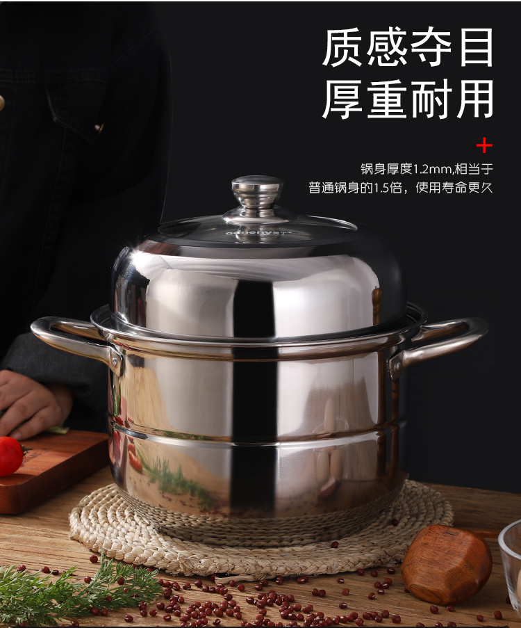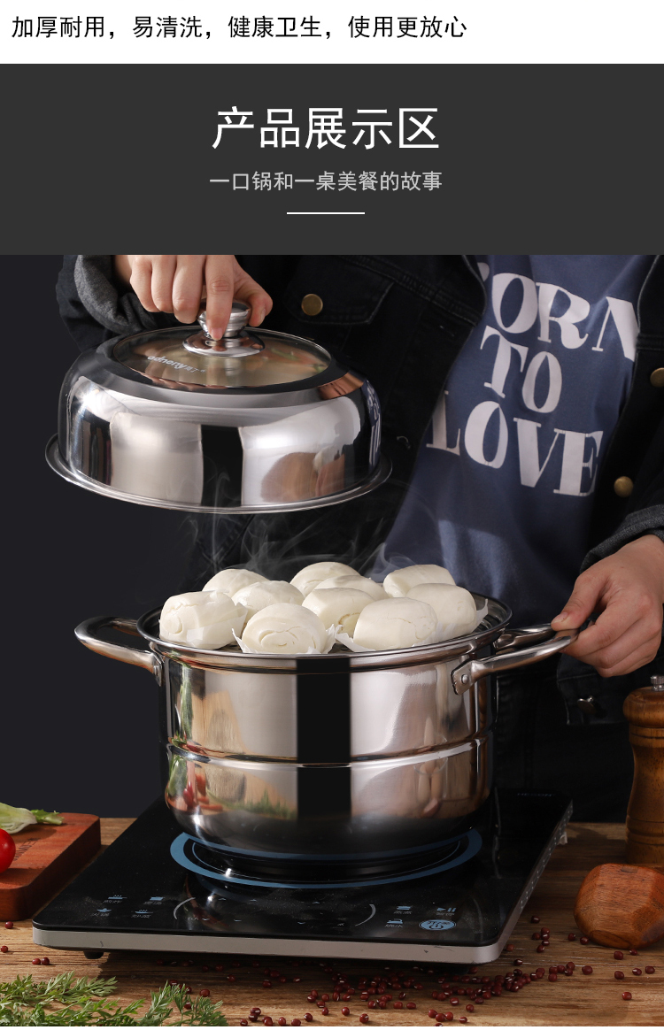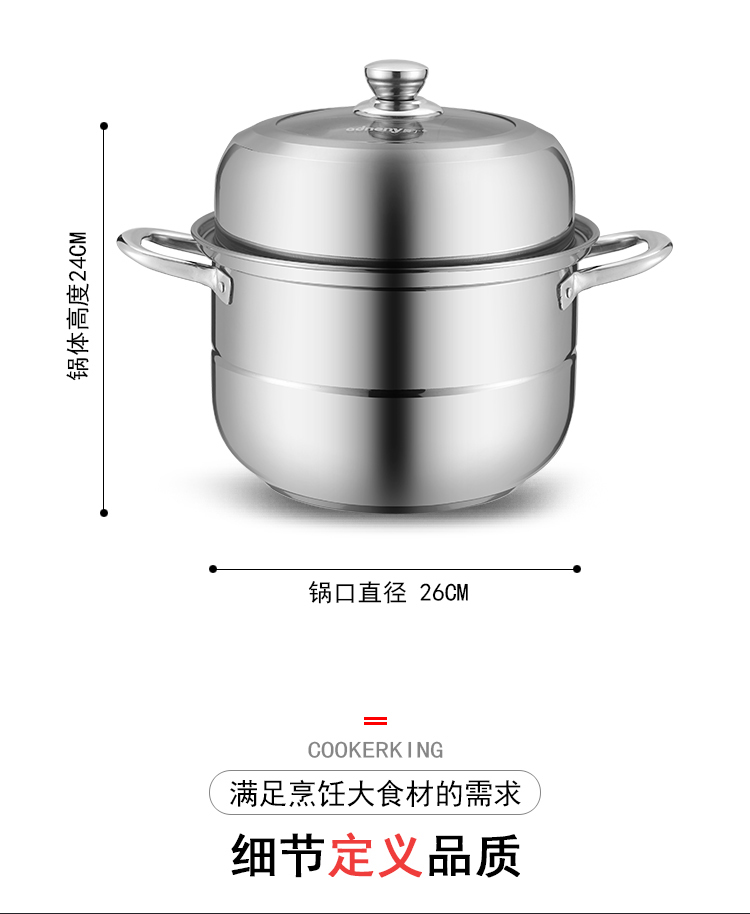 规格:26cm 材质:优质不锈钢 装箱数:8套 产品说明: 1.精选优质不锈钢精制而成,内外精细抛光。 2.全钢手柄更耐用更安全,不易刮花。 3.可视组合盖设计,聚水、保汽、保持食物原味。 4.多层设计,一锅多用、可蒸煮不同食物