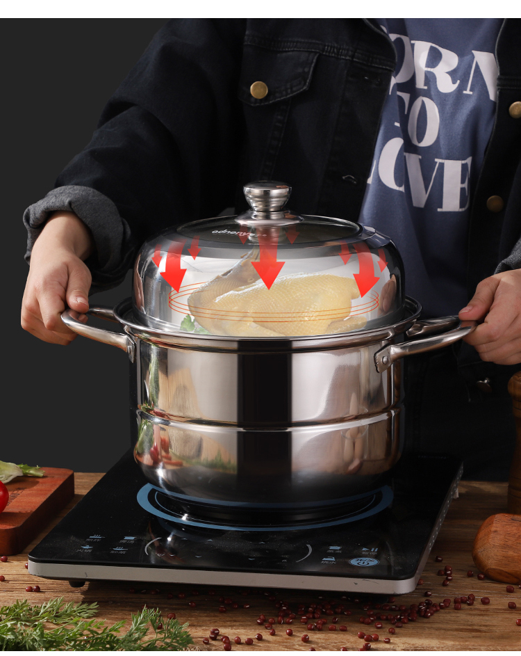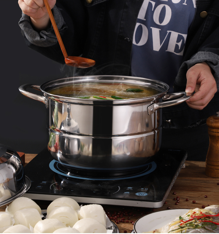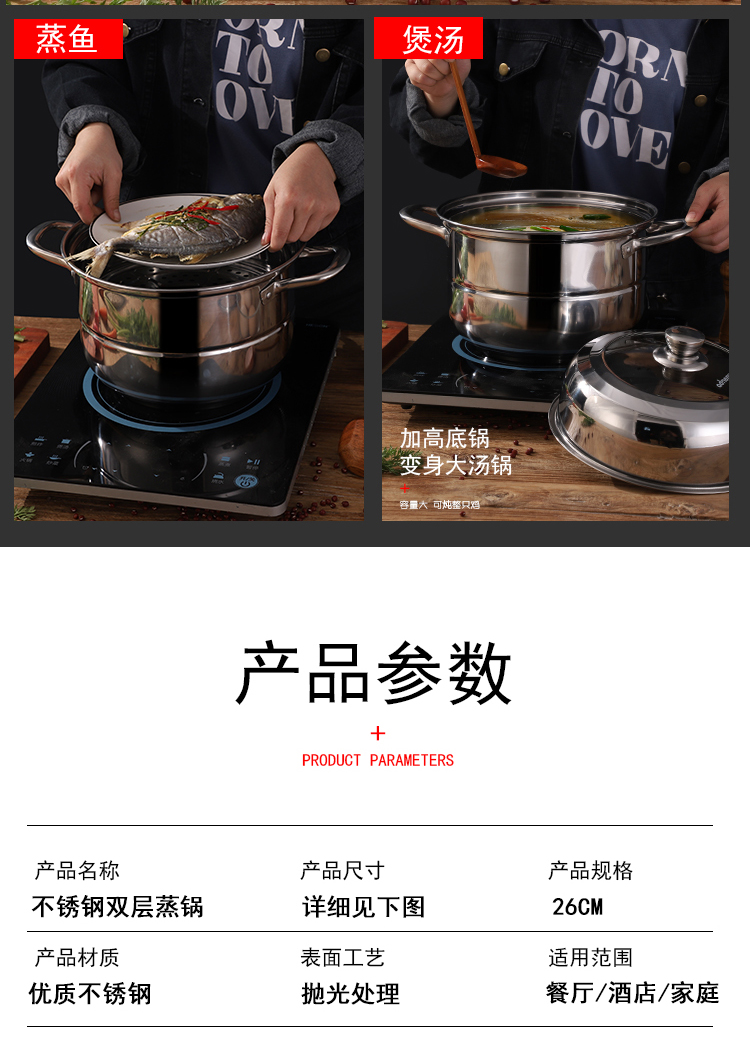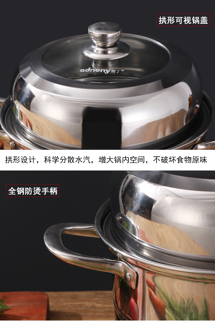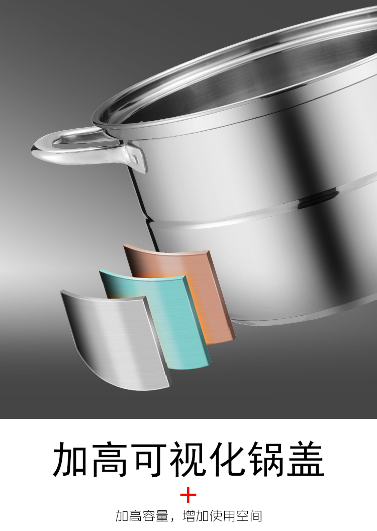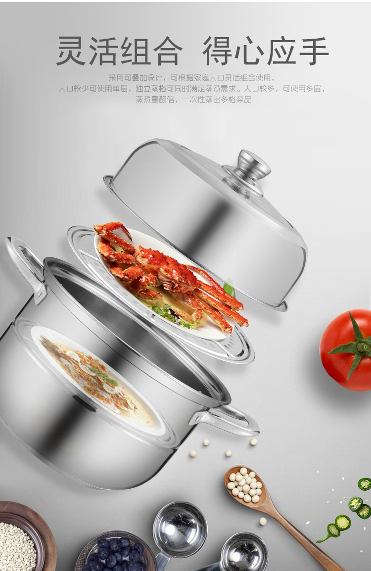 规格:26cm 材质:优质不锈钢 装箱数:8套 产品说明: 1.精选优质不锈钢精制而成,内外精细抛光。 2.全钢手柄更耐用更安全,不易刮花。 3.可视组合盖设计,聚水、保汽、保持食物原味。 4.多层设计,一锅多用、可蒸煮不同食物