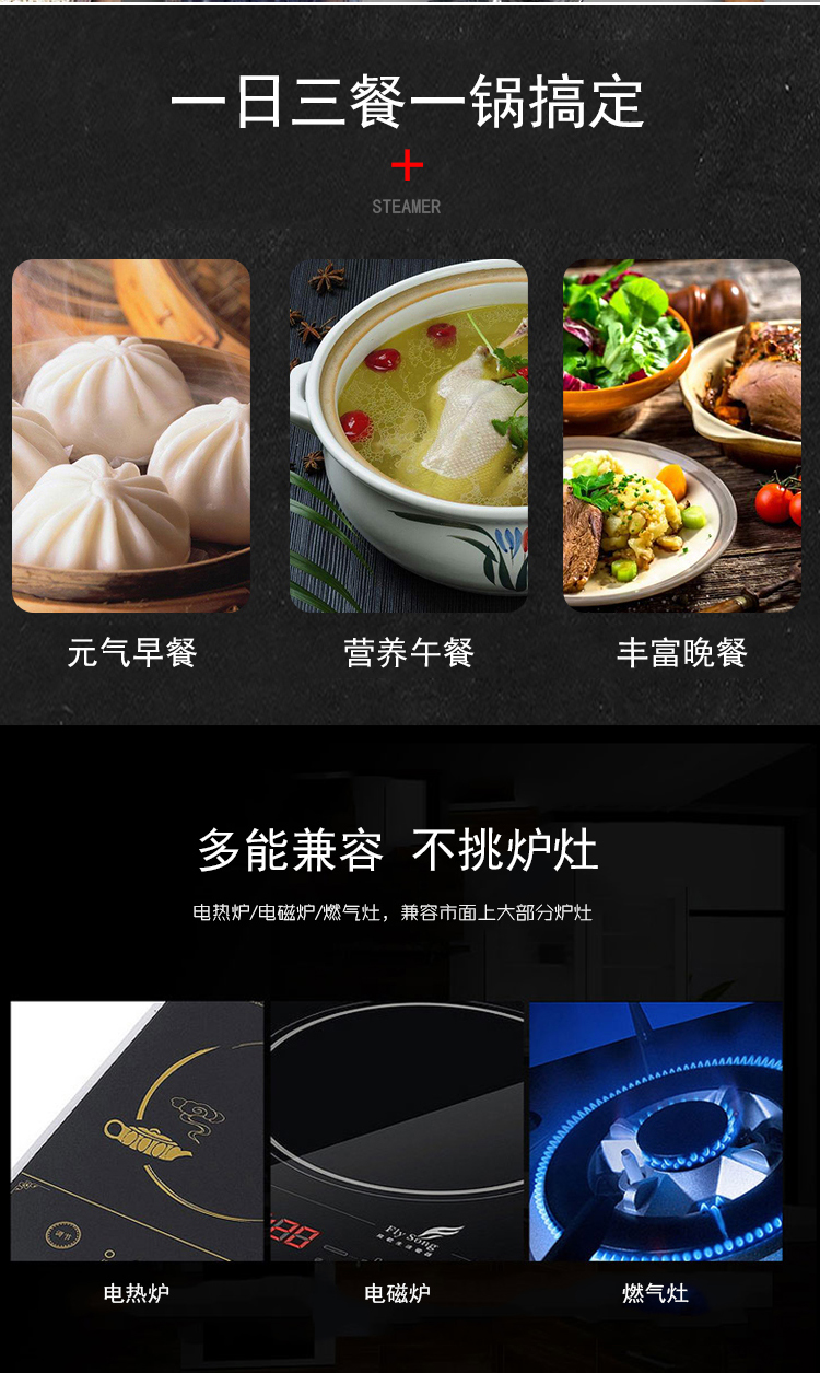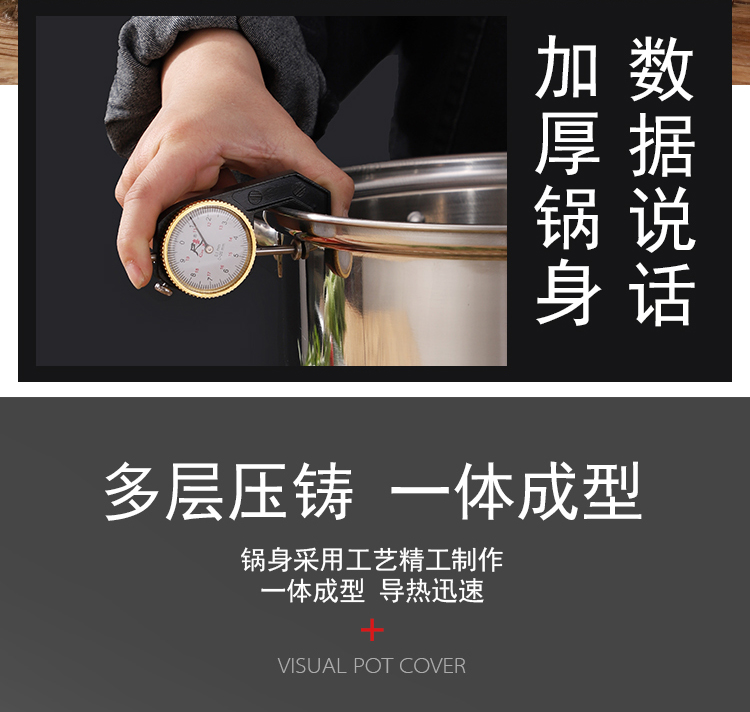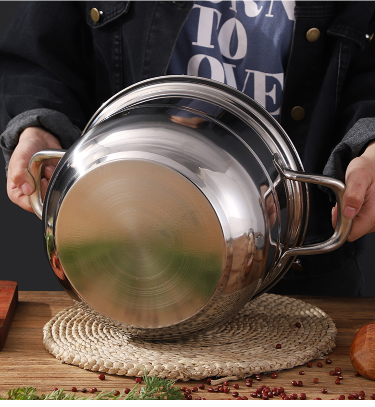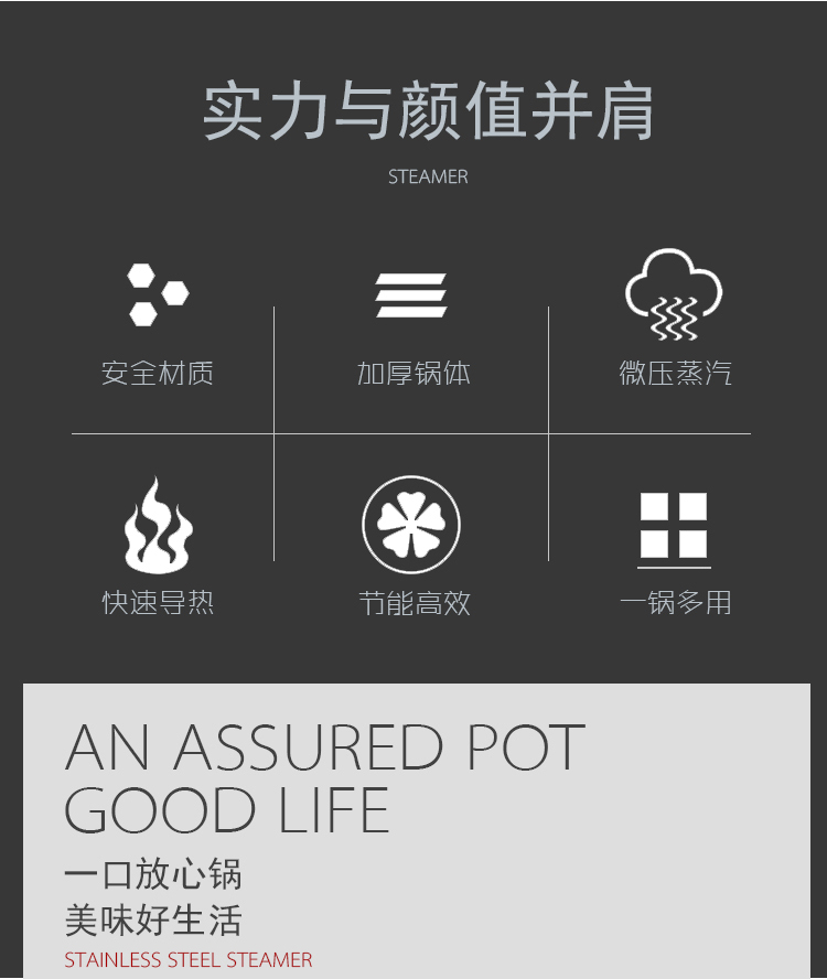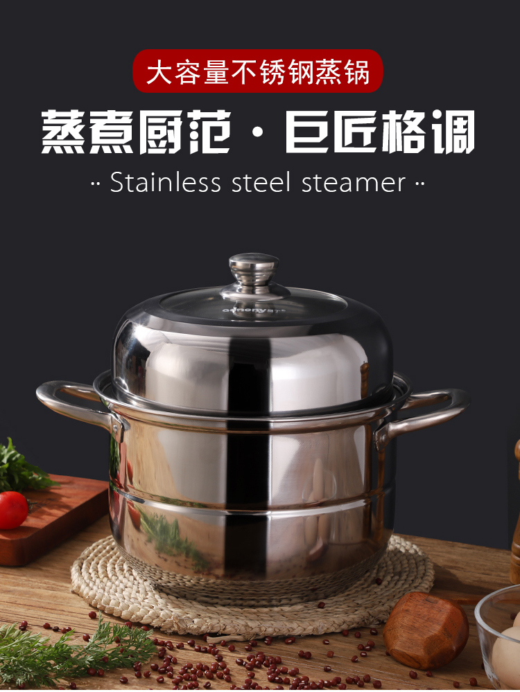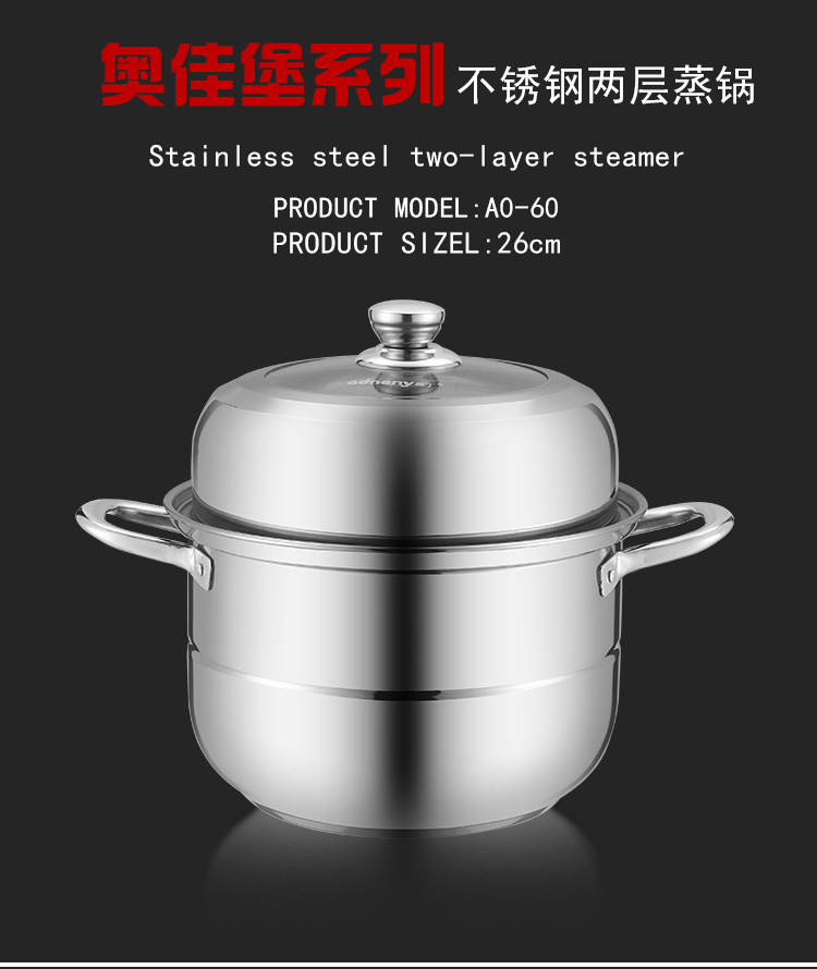 规格:26cm 材质:优质不锈钢 装箱数:8套 产品说明: 1.精选优质不锈钢精制而成,内外精细抛光。 2.全钢手柄更耐用更安全,不易刮花。 3.可视组合盖设计,聚水、保汽、保持食物原味。 4.多层设计,一锅多用、可蒸煮不同食物
