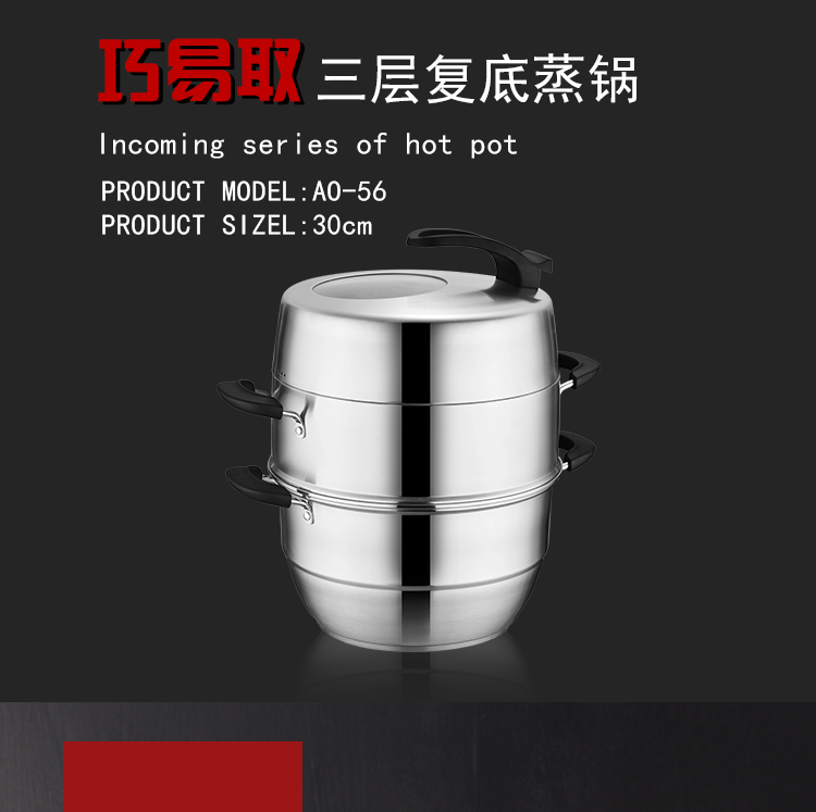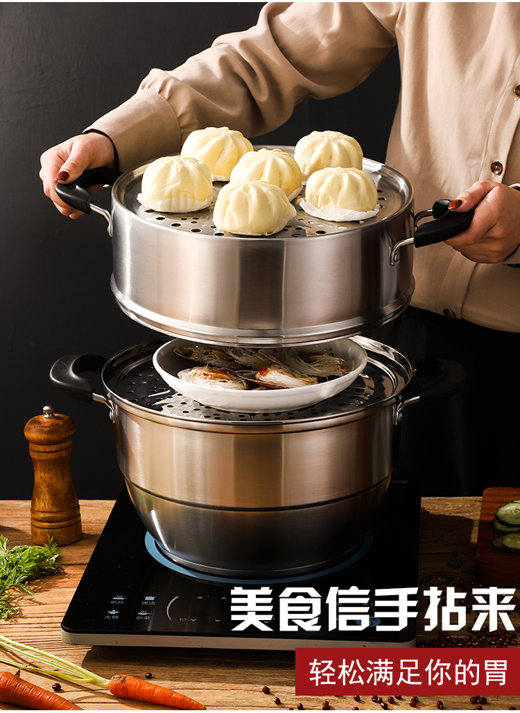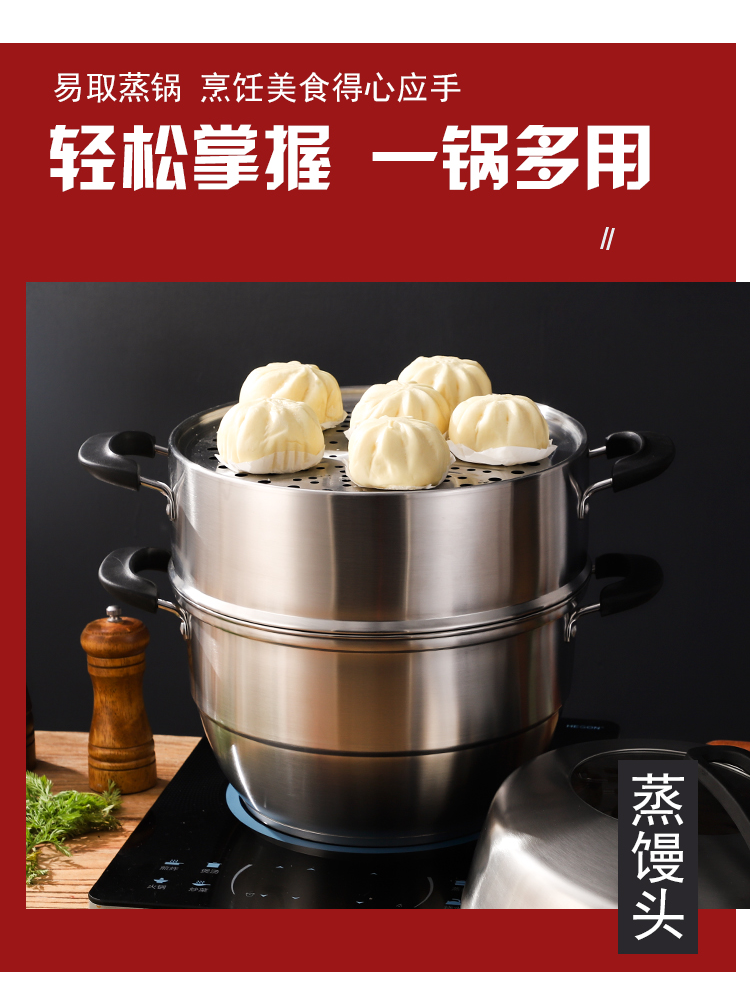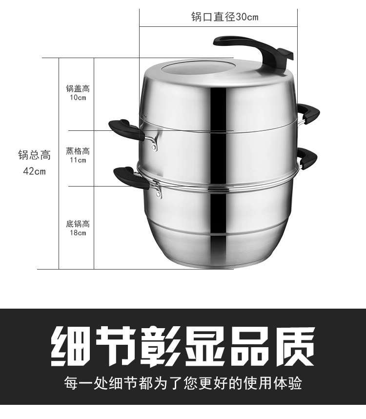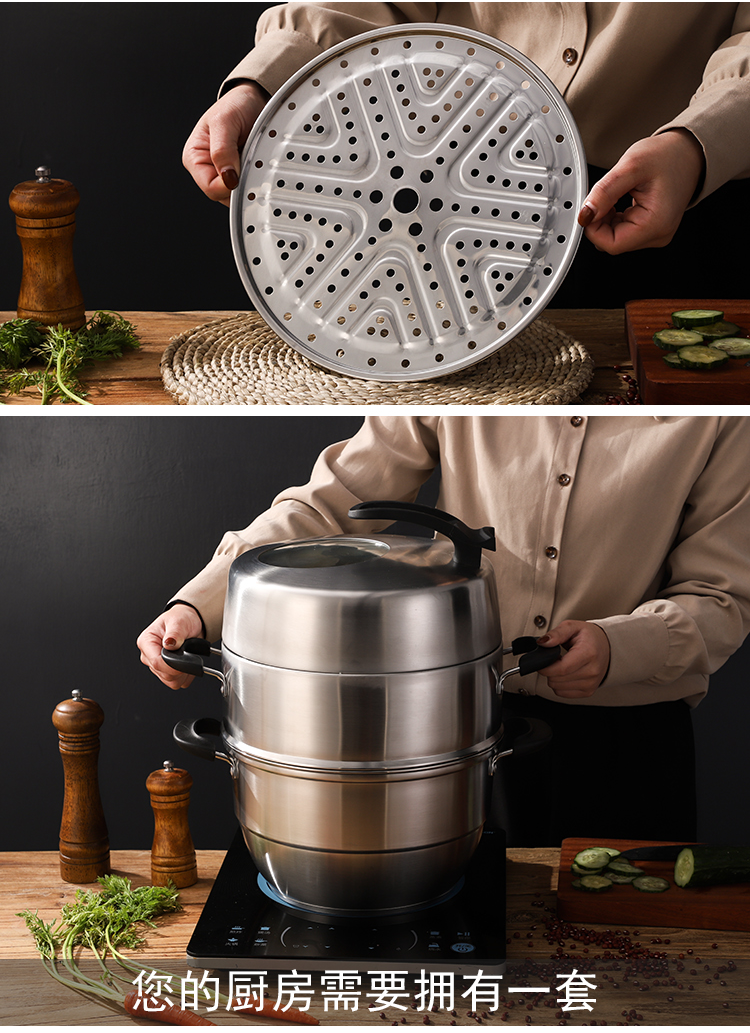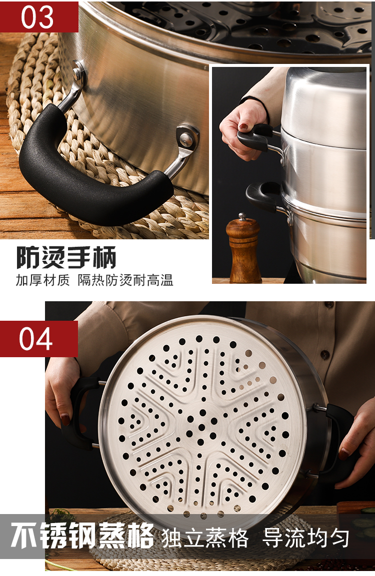 规格:30cm 材质:食品级304SUS 装箱数:6套 产品说明: 1.立体盖子滴水不漏。 2.蒸锅浅格巧放易取。 3.磁力聚能复底,使用起来导热更均匀。 4.防烫电木收,手握舒适。 5.V形蒸片,快速导流。 6.锅体亮光处理工艺,锅身更容易清洗。 7.适用于各种炉灶。