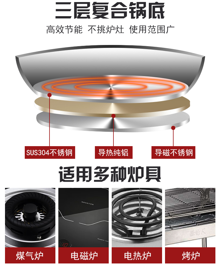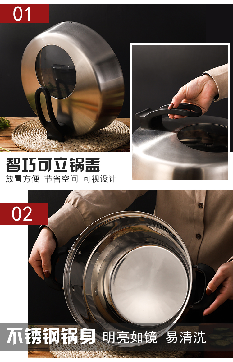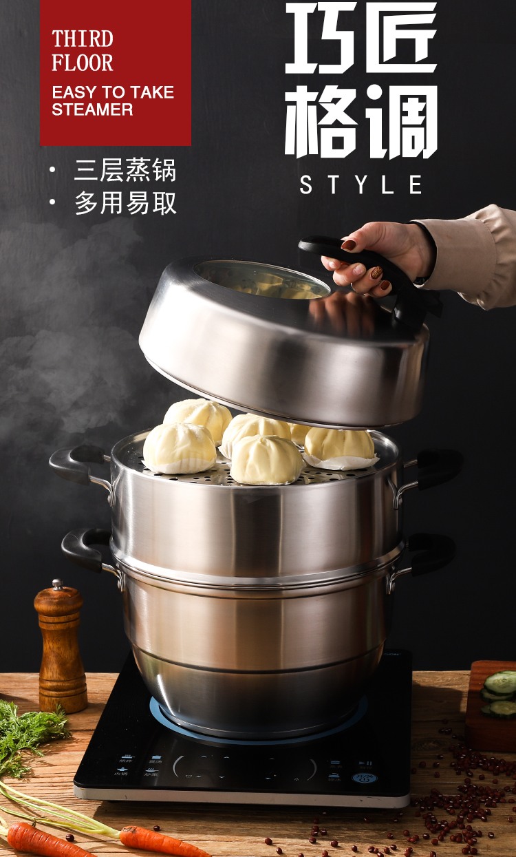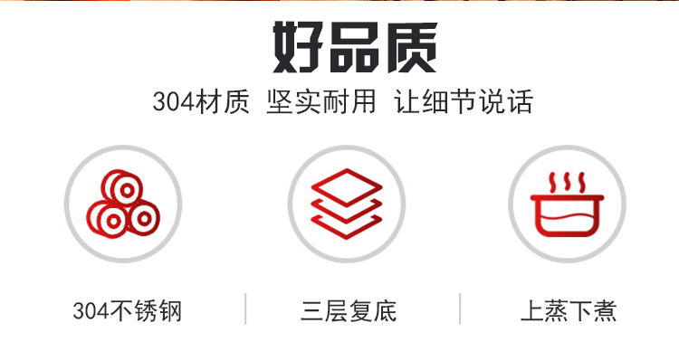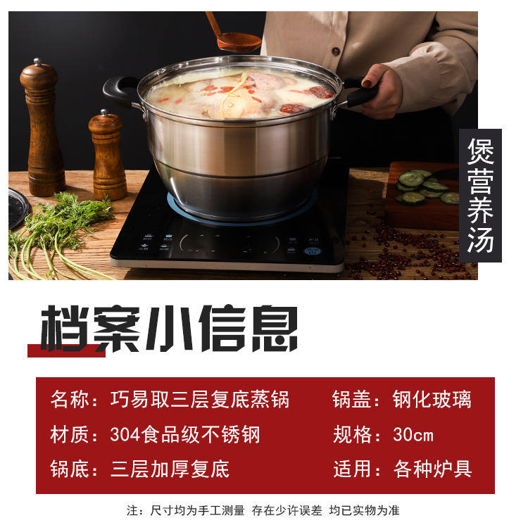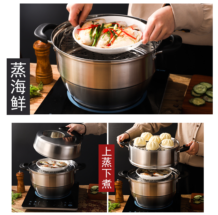 规格:30cm 材质:食品级304SUS 装箱数:6套 产品说明: 1.立体盖子滴水不漏。 2.蒸锅浅格巧放易取。 3.磁力聚能复底,使用起来导热更均匀。 4.防烫电木收,手握舒适。 5.V形蒸片,快速导流。 6.锅体亮光处理工艺,锅身更容易清洗。 7.适用于各种炉灶。