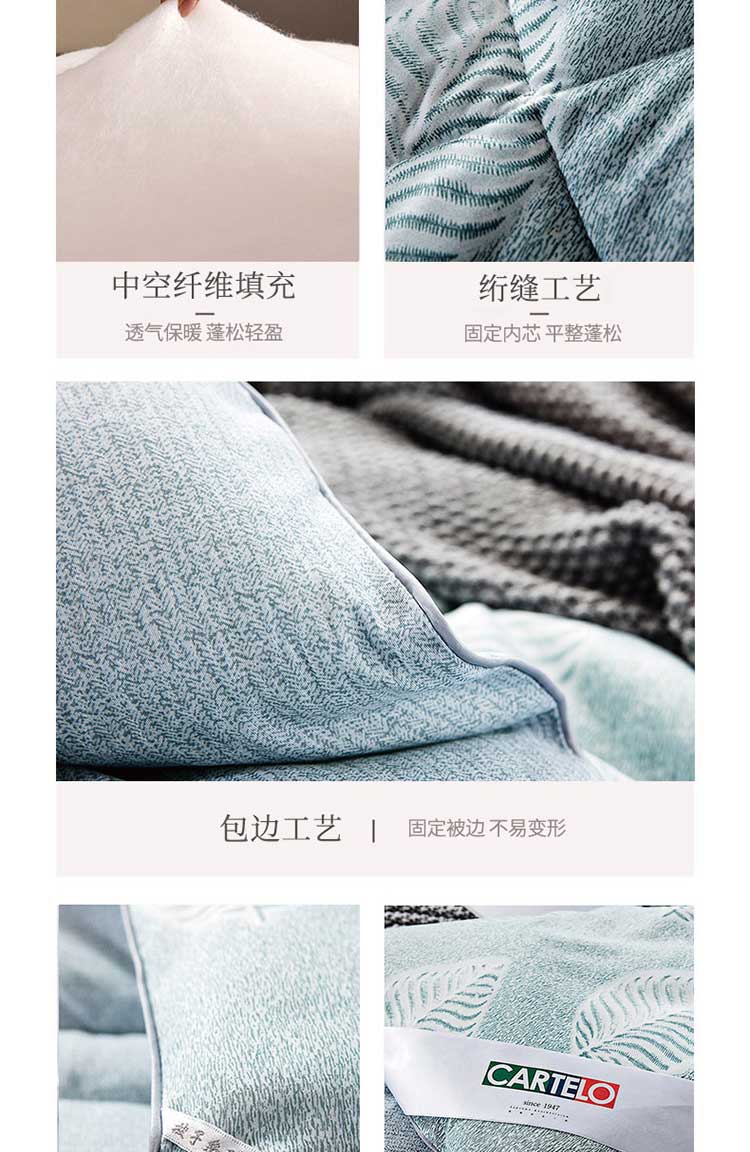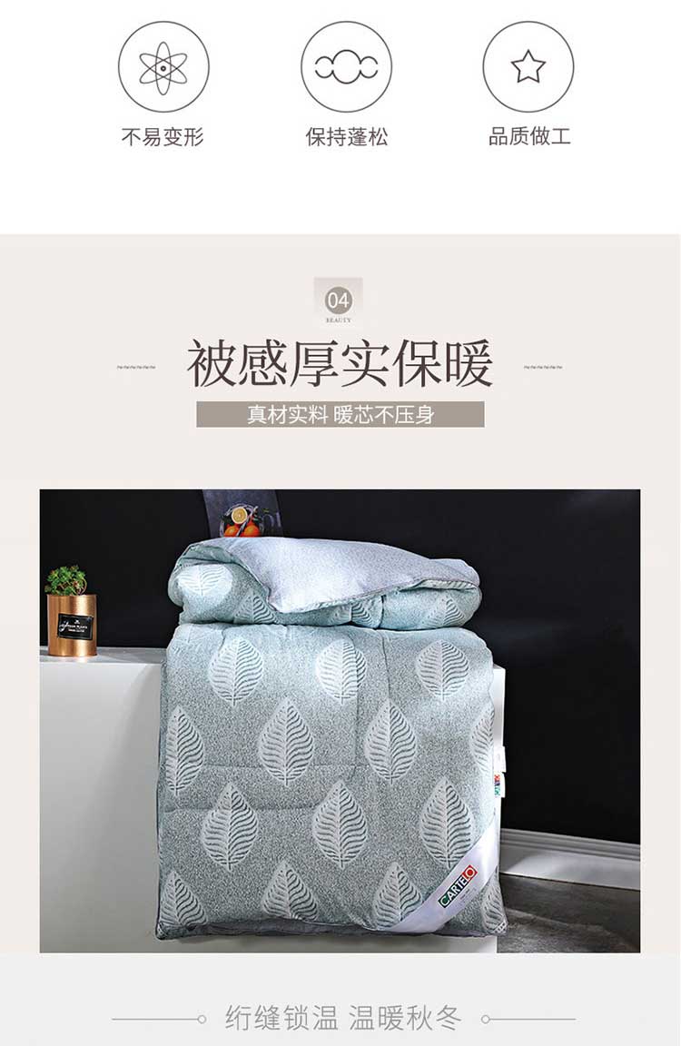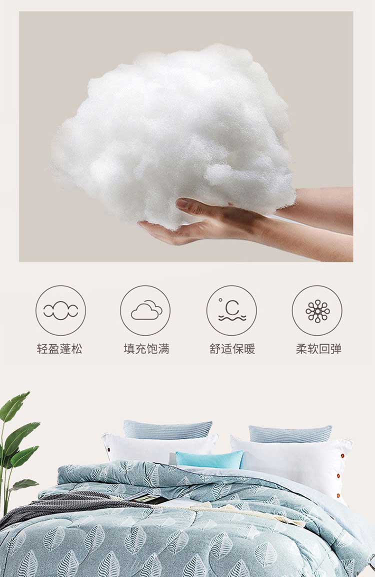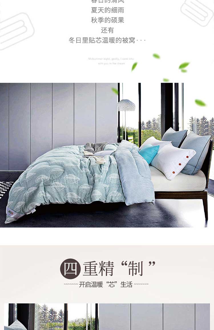 产品规格: 200*230cm 面料成分: 面料 聚酯纤维 填充充分:聚酯纤维,填充克重:1500g 工 艺: 活性印染 包装尺寸: 54*41*28cm 毛重净重: 3.85kg/2.85kg ◆ 蓬松柔软,吸湿透气; ◆ 细腻亲肤,保暖性好,牢牢锁住温度; ◆ 精细做工, 严格把握品质; ◆ 活性印染工艺, 色牢度高, 不易缩水。