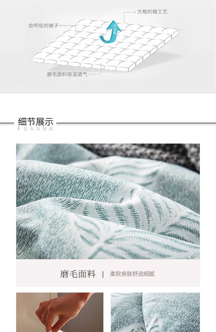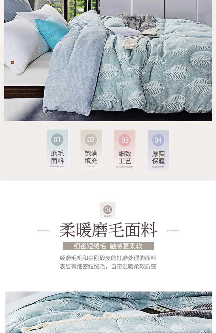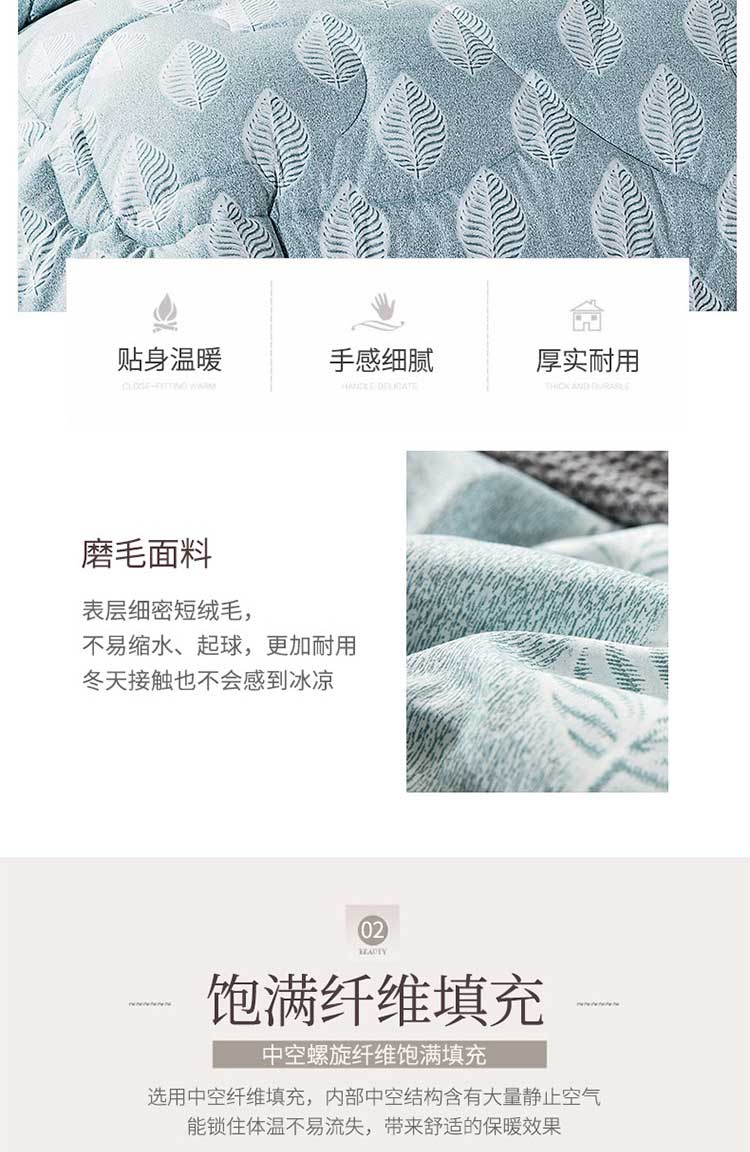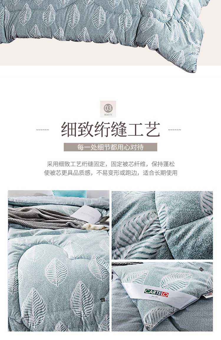 产品规格: 200*230cm 面料成分: 面料 聚酯纤维 填充充分:聚酯纤维,填充克重:1500g 工 艺: 活性印染 包装尺寸: 54*41*28cm 毛重净重: 3.85kg/2.85kg ◆ 蓬松柔软,吸湿透气; ◆ 细腻亲肤,保暖性好,牢牢锁住温度; ◆ 精细做工, 严格把握品质; ◆ 活性印染工艺, 色牢度高, 不易缩水。