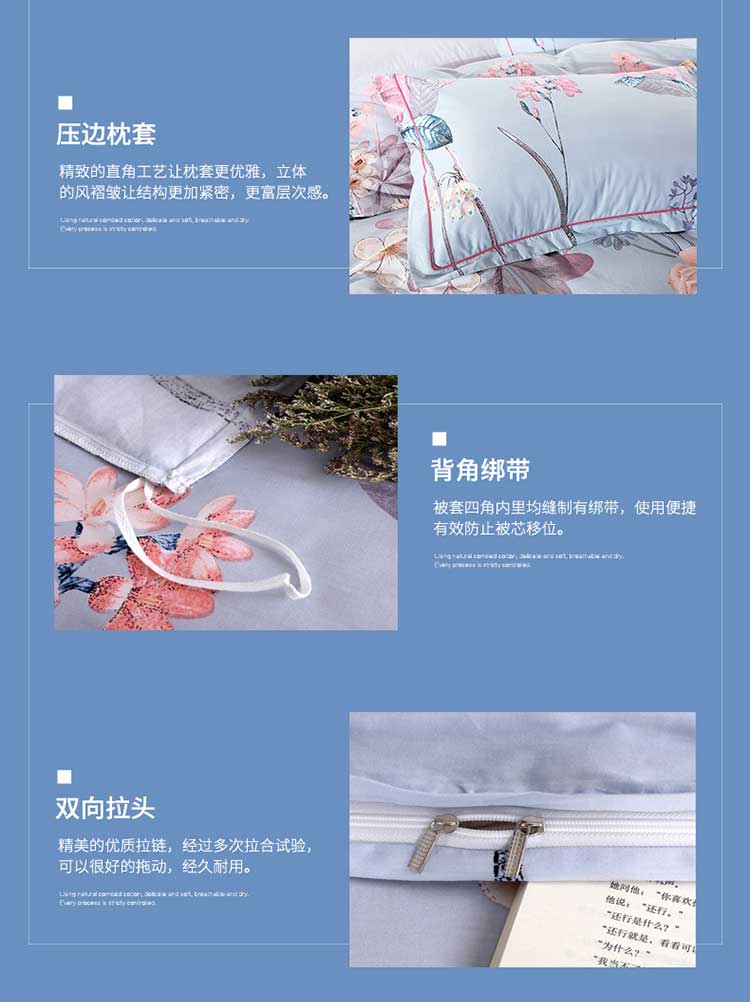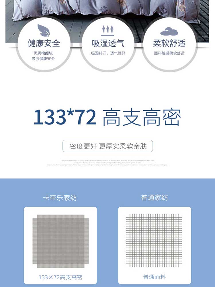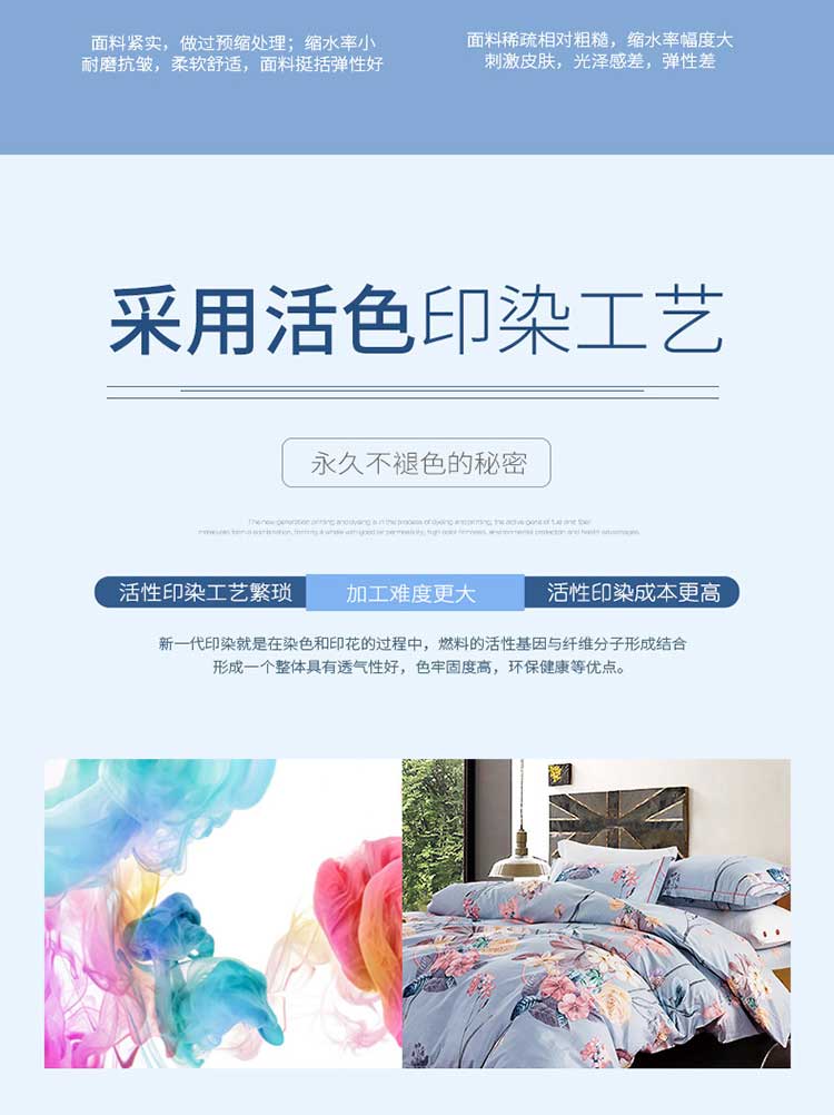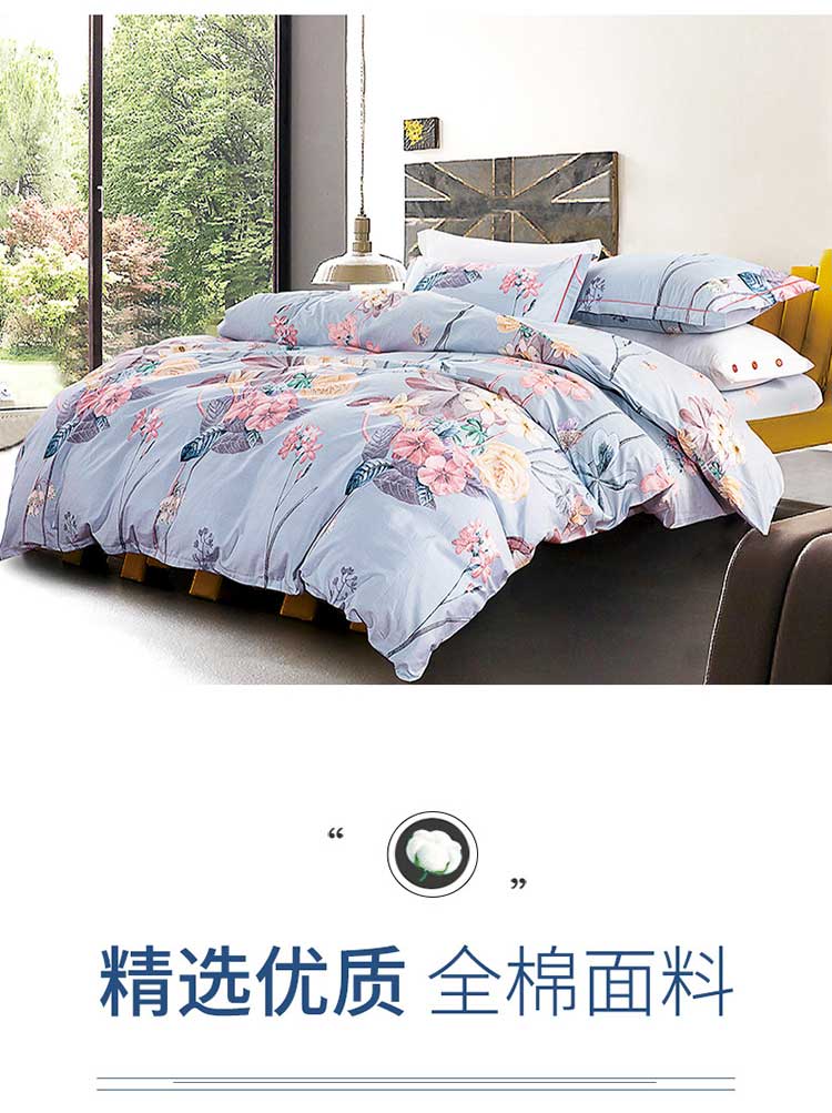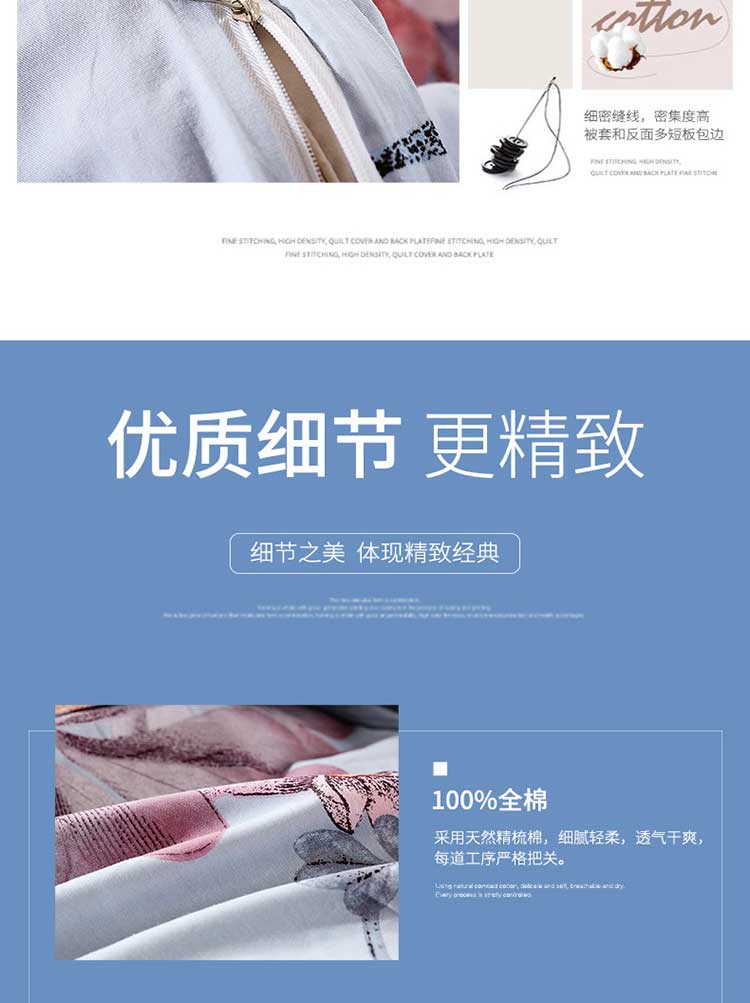 产品规格:被套:200*230cm 床单:250*250cm 枕套:48*74cm*2 产品材质:棉100% 工 艺:活性印染 包装尺寸: 52*38*10.5cm 外箱尺寸: 66*53*43.5cm 毛重净重: 4.1kg/2.6kg 装 箱 数: 6套 ◆ 高支高密,足支足密; ◆ 亲肤面料安全健康; ◆ 透气排汗亲肤舒适 ◆ 保暖性好,牢牢锁住温度; ◆ 精细做工,严格把握品质; ◆ 活性印染工艺,色牢度高,不易缩水。